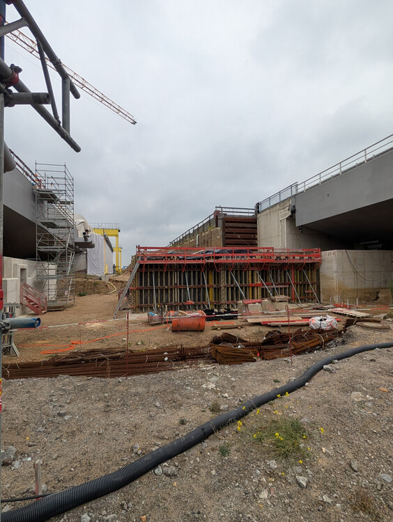 24. Zur Straße hin wurde ein Graben ausgehoben und es wurden Styroporteile einbetoniert, die als „Schablonen“ für die bald kommende überschnittene Bohrpfahlwand verwendet werden.