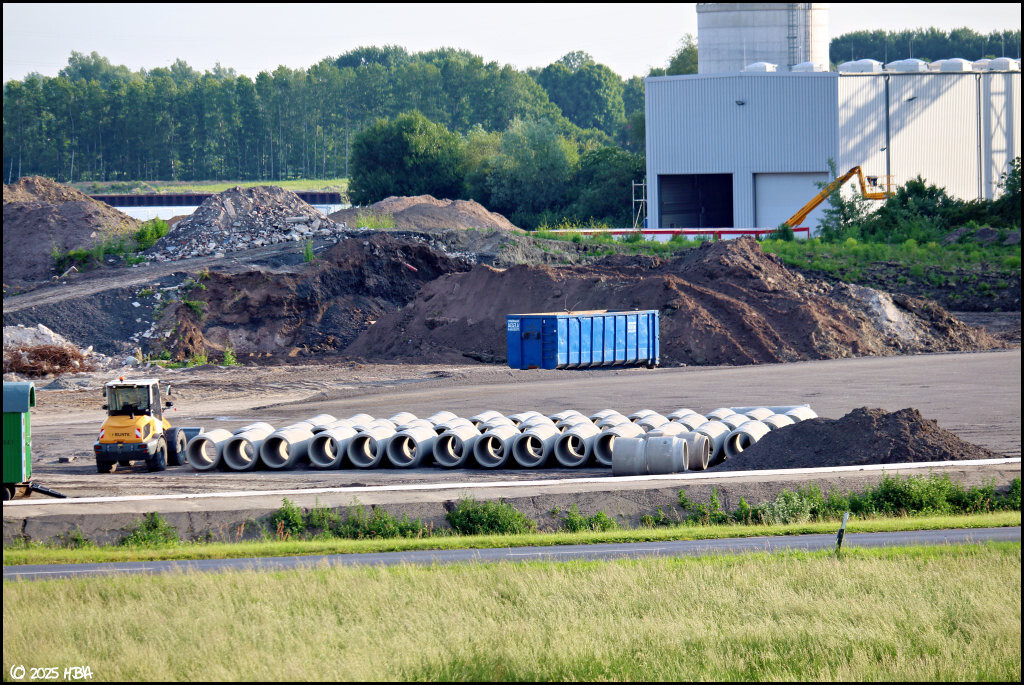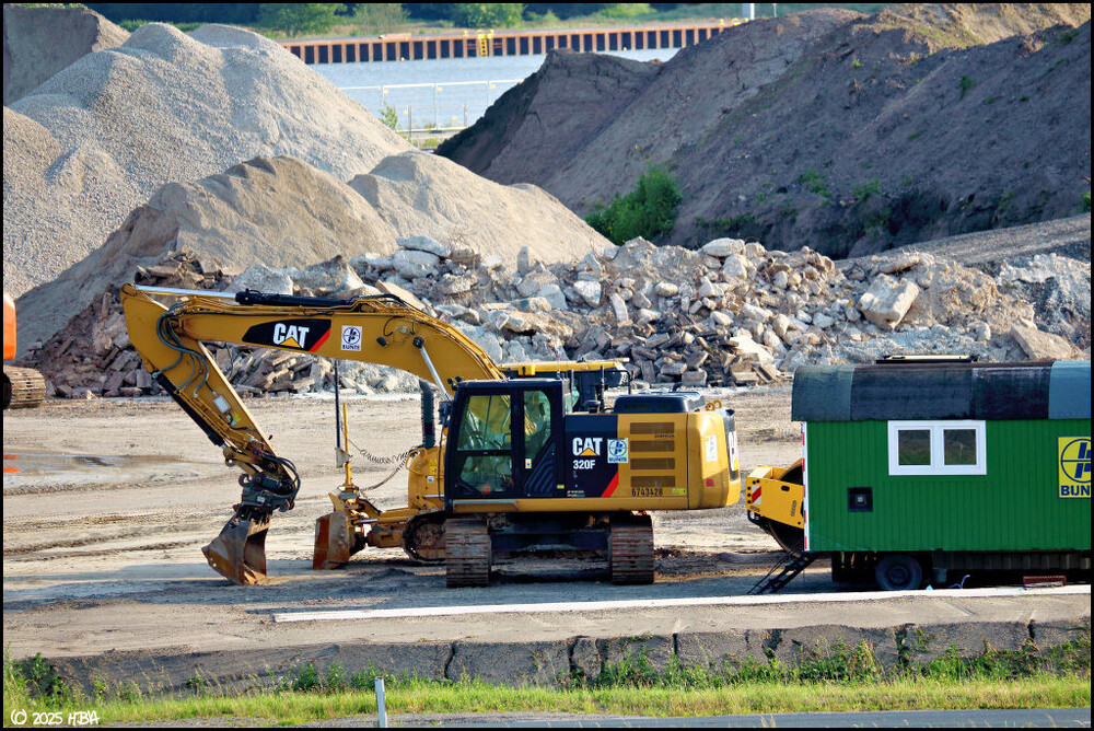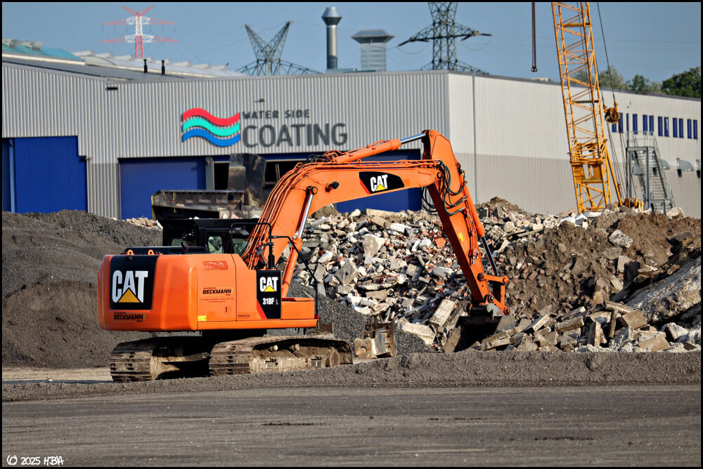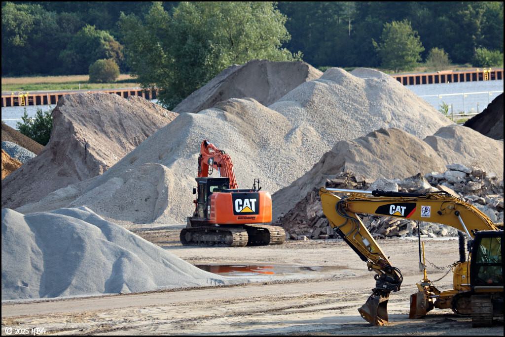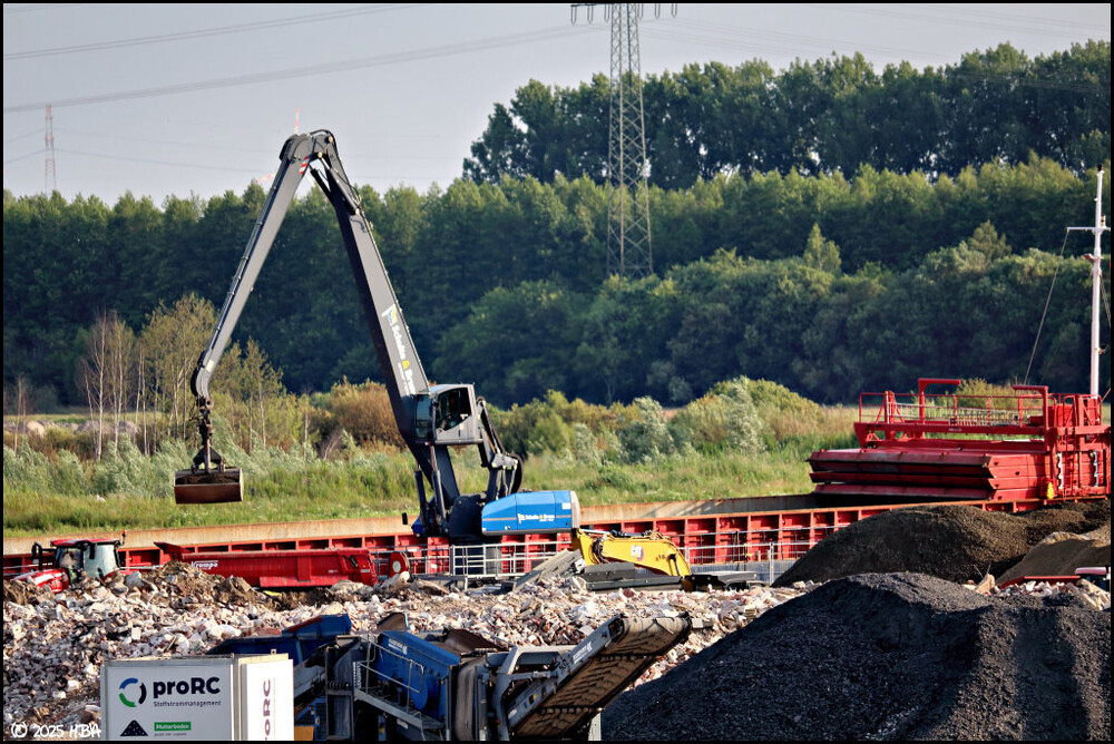 Bilder der Bunte-Tochter ProRC von Mitte Juni 2025. Der Umbau des Betriebsareals von einem ehemaligen Lagerplatz zu einem Recyclingbetrieb ging während des laufenden Betriebs weiter. Ein Caterpillar 318FL der Firma Beckmann schien auszuhelfen.