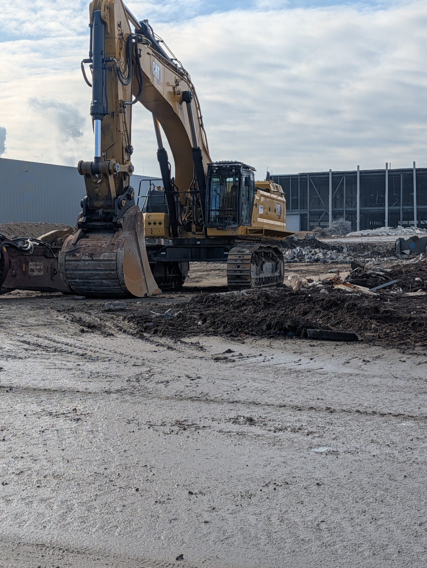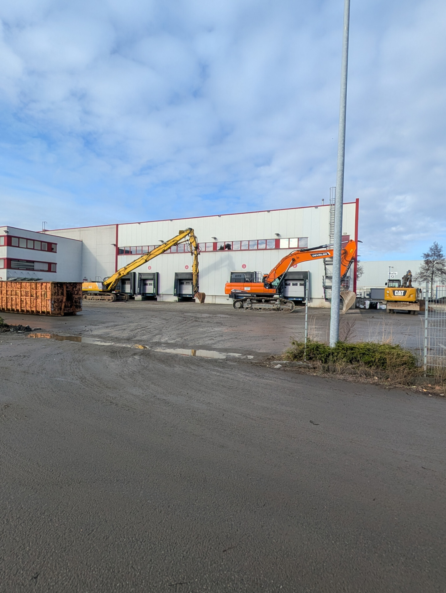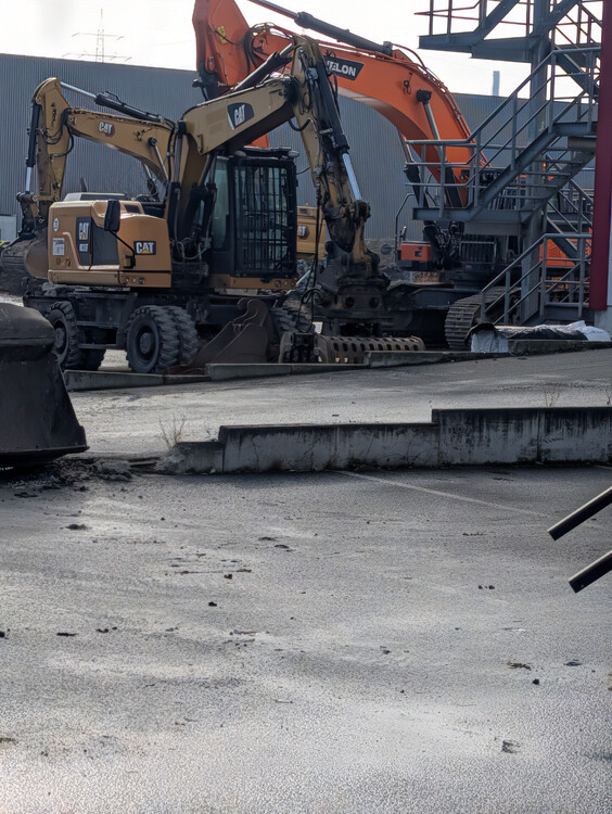 Neu auf der Baustelle ist der Volvo EC300D und ein CAT 318F Mobilbagger Der vordere Teil der Halle ist bereits abgerissen