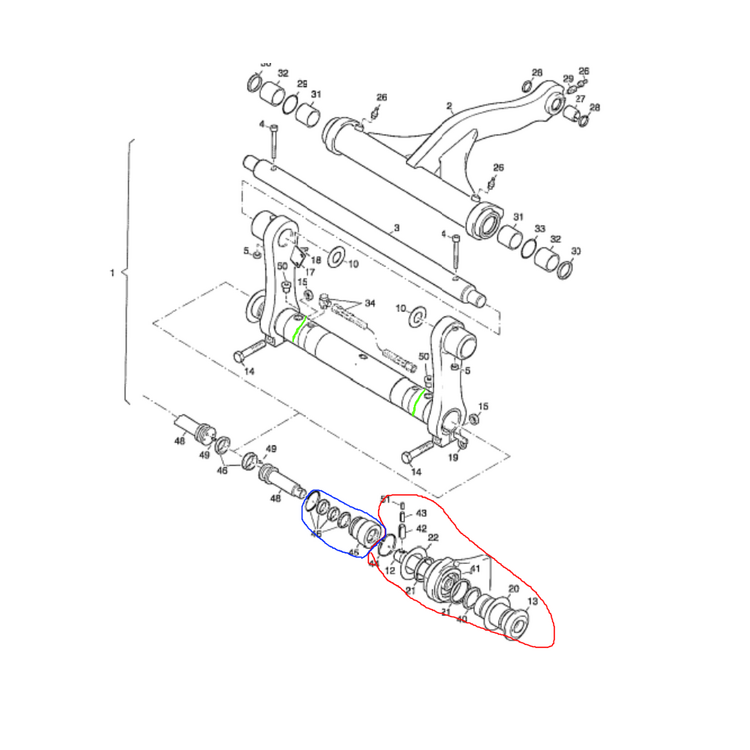 2. Hallo zusammen, von meinem Ar 55 ist das Dichtungspaket auf einer Seite des Hyd. Schnellwechslers geplatzt. Haben soweit alles zerlegt, allerdings ist die Frage wie man jetzt an die Dichtungen rankommt, da die immernoch gut 12 cm tief im Rohr vom Rahmen sitzen (Grüne Markierung). Ist da ein Hydraulikzylinder eingeschoben oder laufen die Kolben in dem Rohr? Auf der Explosionszeichnung sieht mir das nach letzterem aus, dann ist die Frage wie ich das blau markierte Teil demontiere um da dran zu kommen? Alles Rot markierte inkl. dem Sprengring haben wir ausgebaut auf beiden Seiten. Viele Grüße