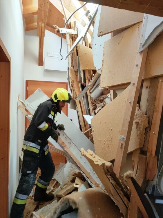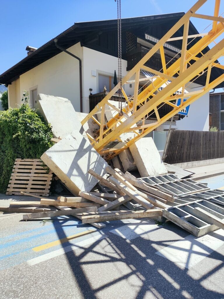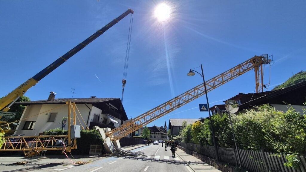 Kran Umfall in Südtirol auf Wohnhaus. https://www.suedtirolnews.it/chronik/kran-kippt-in-lana-auf-haeuserdach Bilder: Landesfeuerwehrverband Südtirol