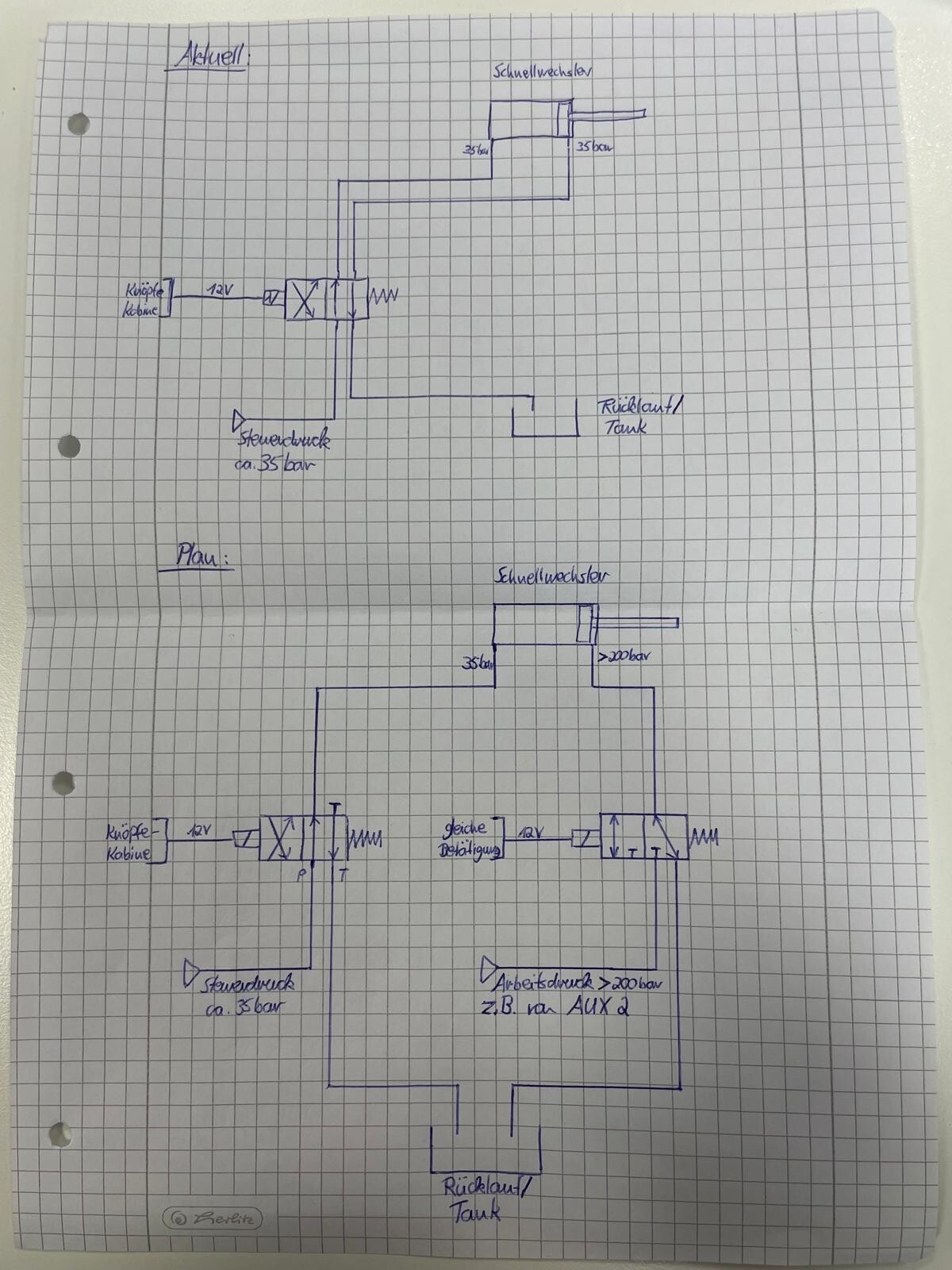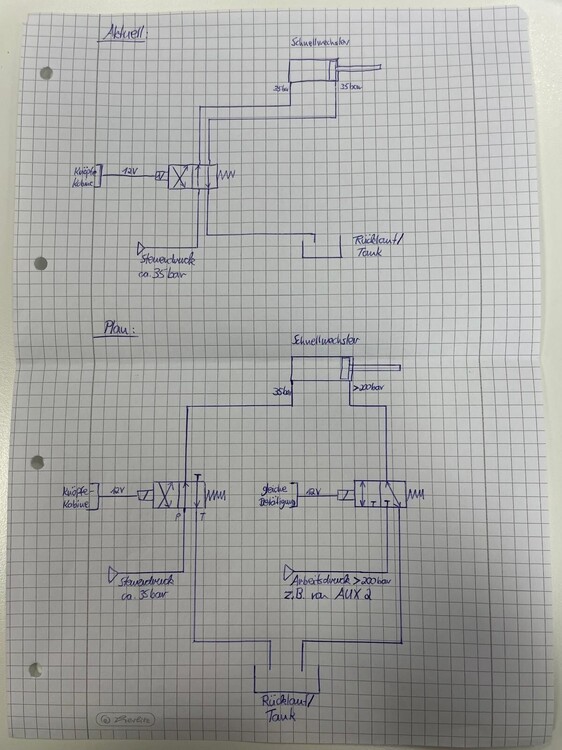 Servus, ich habe mir einen relativ neuen Lehnhoff Powertilt mit hydraulischem Schnellwechsler an meinem tb175 gekauft (war zu einem guten Preis, deshalb gleich zugeschlagen). Jetzt habe ich folgendes Problem. Der SW benötigt zum Zylinder Ausfahren (verriegeln) min. 30bar bis max. 320bar und zum Einfahren (entriegeln) um die 180-320bar. Der tb175 (bj. 2007) hat jedoch zum öffnen und schließen nur dem Vorsteuerdruck von ca.37 bar. Fürs Schließen möchte ich das auch so beibehalten, sodass nicht ständig Arbeitsdruck ansteht. Fürs Öffnen möchte ich es jetzt noch umbauen. Jetzt die Frage ob jemand das auch schon gemacht hat oder eine Idee hat. Meine aktuelle Idee ist es ein zusätzliches 3/2-Wegeventil einzubauen welches ich gleichzeitig mit dem aktuell verbauten Schnellwechsler-Ventil schalten werde (Doppelte Sicherheit der zwei-Schalter-Betätigung bleibt bestehen). Als „P“ habe ich mir da gedacht benutzte ich den Druck vom AUX2 d.h. ich muss halt noch einen zusätzlichen Knopf drücken. Aber so habe ich nicht das Problem wo ich mir den Arbeitsdruck sonst wieder herholen kann. „T“ kann ich einfach mit einer Abzweigung auf die bestehende Tankleitung am Schnellwechsler-Ventil und Abgang ist die B-Leitung zum Schnellwechsler vor. Ich habe ein Bild angehängt wie ich es mir vorstelle. Gerne Vorschläge und Berichtigungen. Gruß Florian