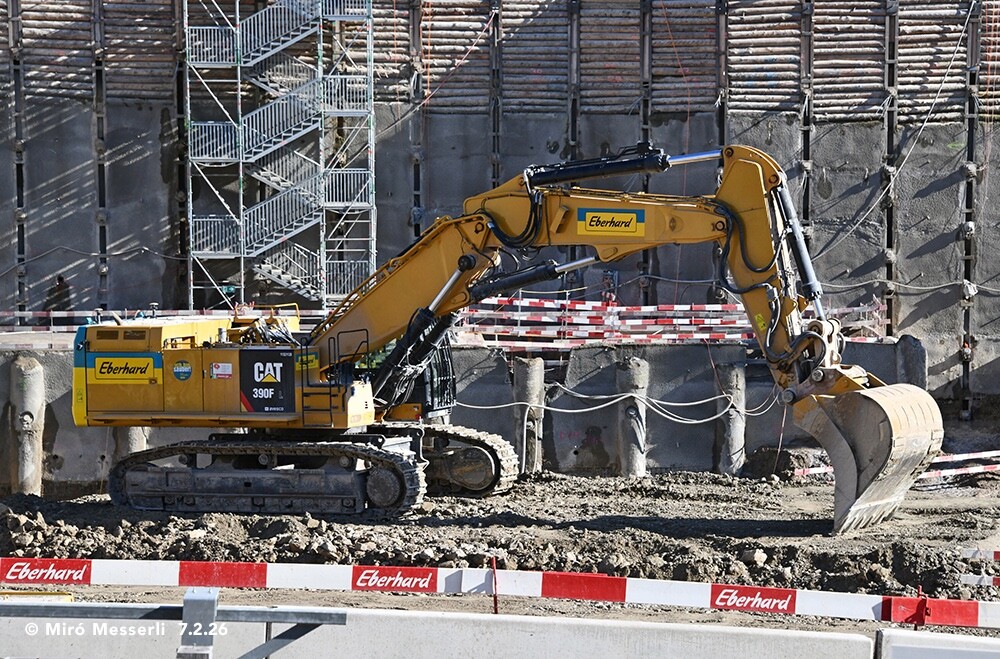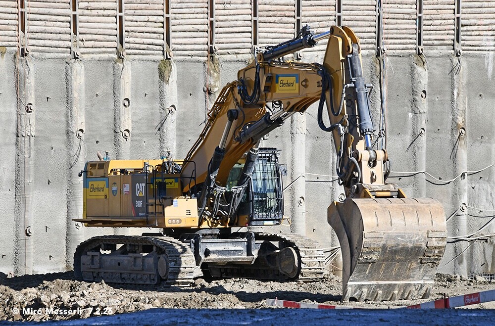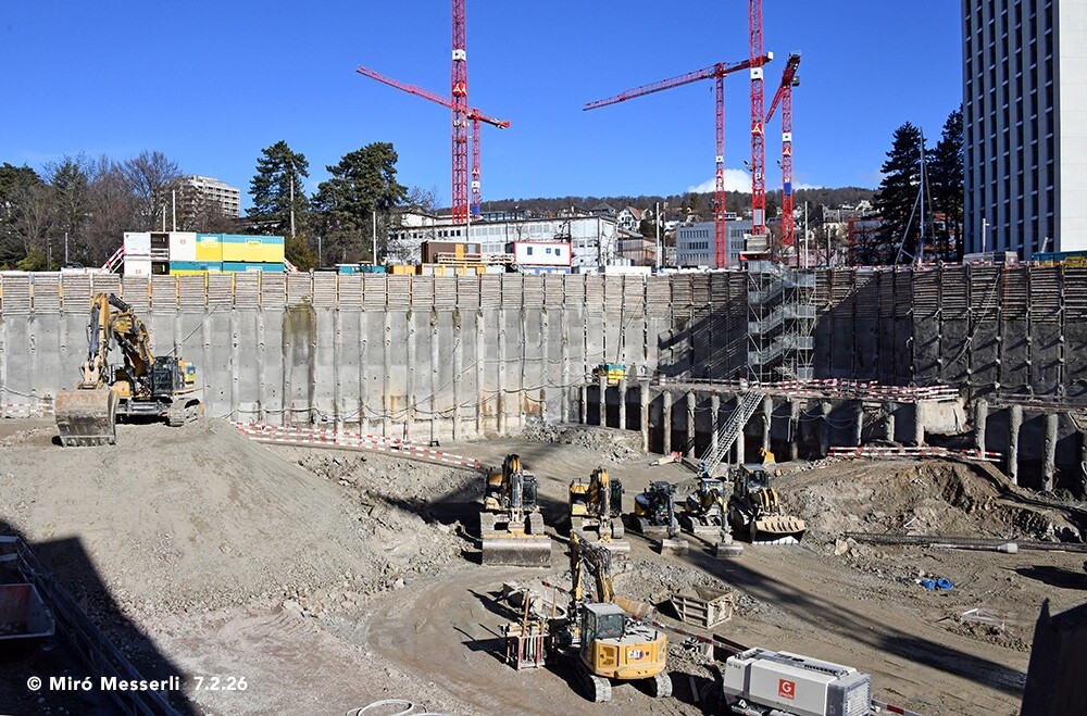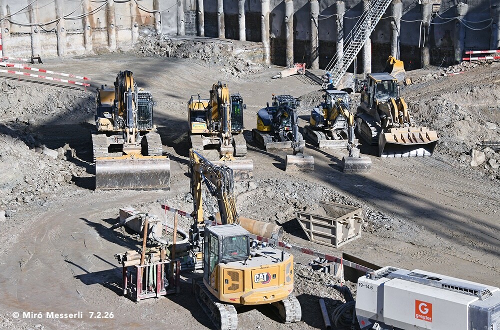 Baugrube Neubau FORUM UZH (Universität Zürich). Es werden 3-4 Untergeschosse und 7 Obergeschosse gebaut. Der Baugrubenaushub umfasst gemäss Angabe Bauherr 180’000m3 und sollte bald abgeschlossen sein. Je tiefer die Baugrube, desto schwieriger sind die Baumaschinen zu fotografieren. Dafür kommt der Cat 390F vor der Bohrpfahlwand besser zur Geltung. Gruss Miró