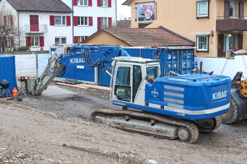 Von diesen Volvo Ladern in Werksfarben gibt es mehrere, habe sie schon auf diversen Spezialtiefbaustellen gesehen Cat 330 NG VA "Stonebreaker" der Kibag Winterthur bei einem Aushub in Zürich, 12/2024