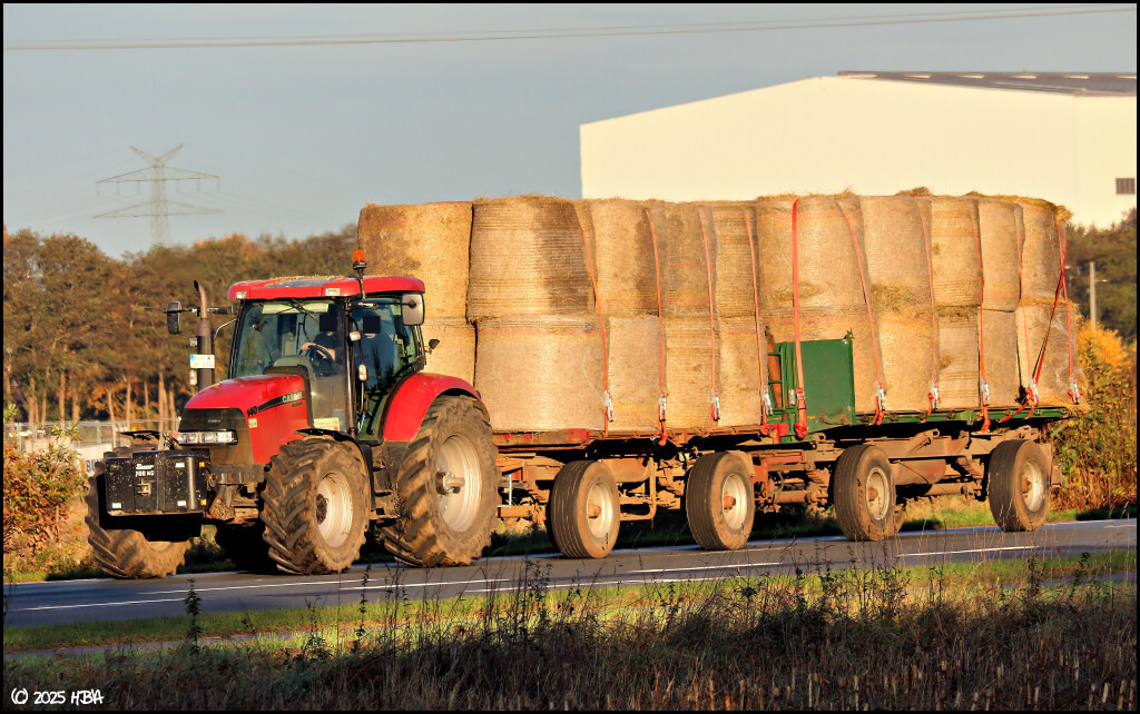 Ein Case IH Maxxum 140 mit mit zwei Wagen voller Stroh.