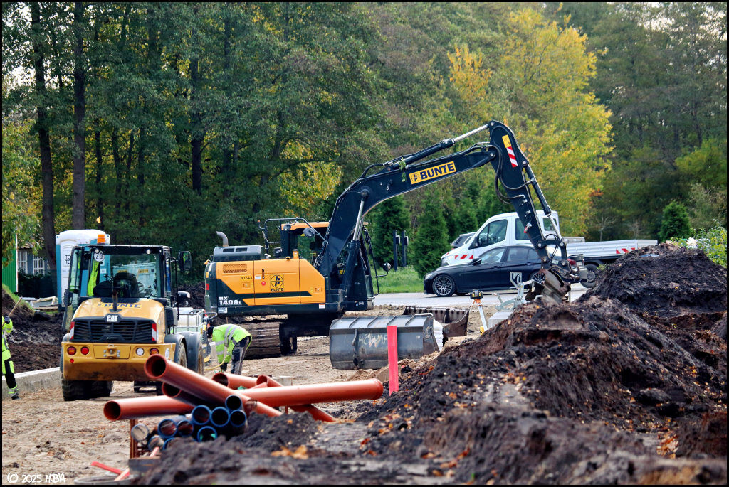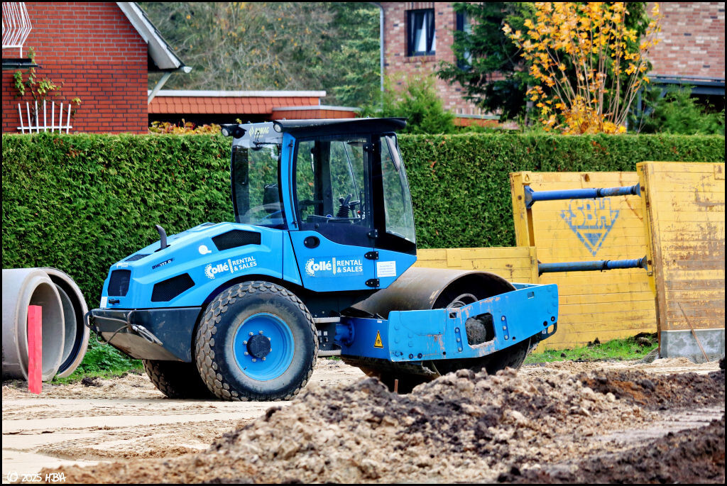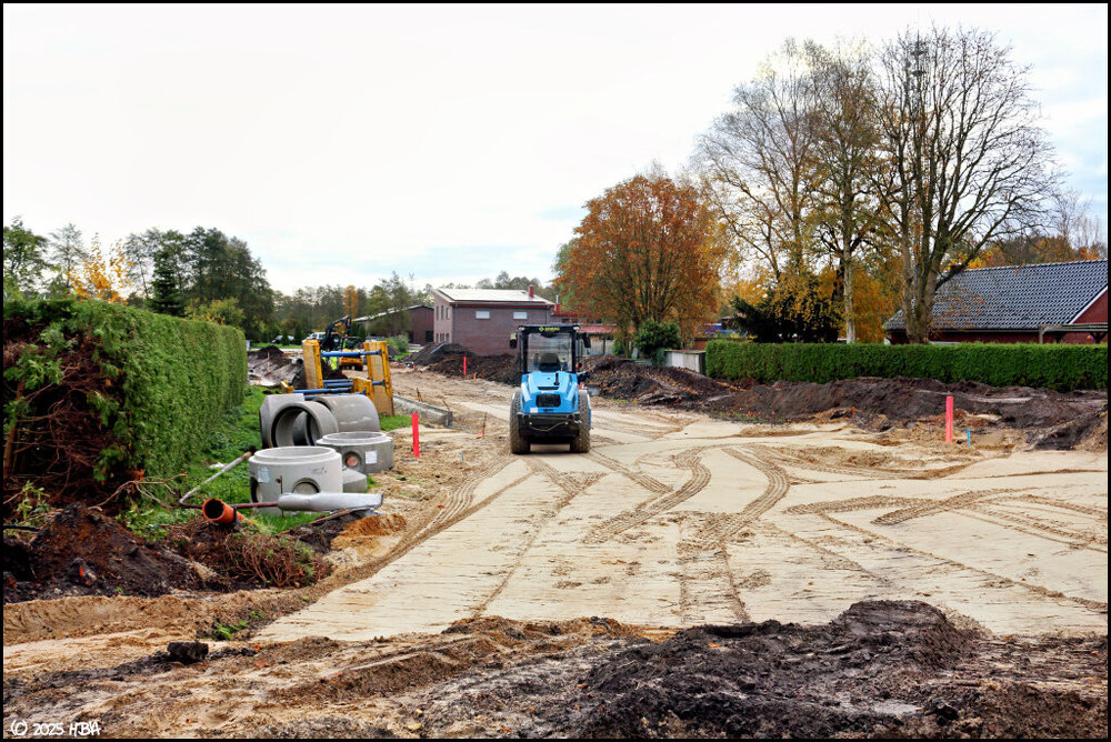 3. Die Firma Bunte ist derzeit damit beschäftigt, einem kleinen Gewerbegebiet am Papenburger Untenende eine zweite Zufahrt zu bescheren. Neben eigenen Baggern und Radladern kommt dort auch ein von Colle gemieteter Bomag Walzenzug zum Einsatz.
