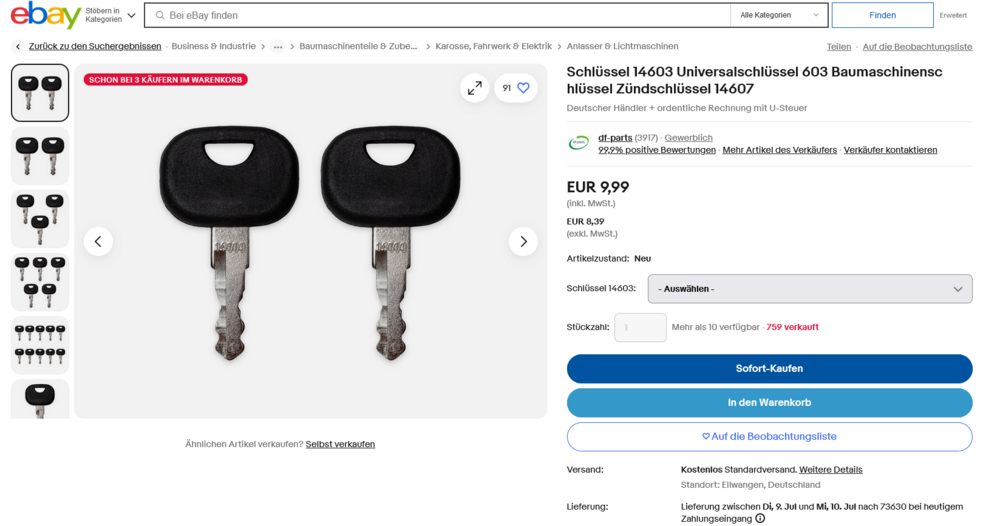 DavidF 3 Geschrieben 26. Juli 2024 Autor Geschrieben 26. Juli 2024 Hallo, zur Lösung meines Problems: der 14603 ist es nicht (braucht jemand diese Schlüssel? 3 Stück - 4€ inkl. Versand). Es ist der 14610 - passend auch bei alten Deutz-Treckern... Trotzdem Dank für eure Hilfe! Vielleicht hilft die 14610 evtl. auch mal anderen! LG David (vom Niederrhein) 1 2 Zitieren