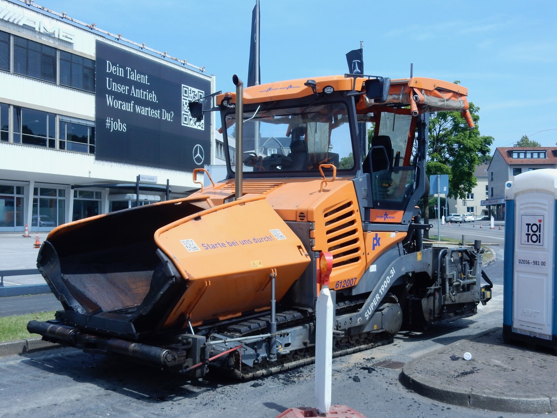 tomac 11.993 Geschrieben 14. Juni 2025 Geschrieben 14. Juni 2025 Aus Aldenhoven bei Aachen kommt die Firma Philipp Kutsch GmbH. Das Dienstleistungsangebot reicht vom Verkehrswegebau über den Ingenieur- und Industriebau bis zum Kanalbau. Dazu betreibt Kutsch einen umfangreichen Fuhrpark. Fahrzeuge von Kutsch habe ich schon in diversen Beiträgen gezeigt, aber nie einen eigenen Thread für die Firma angelegt. Das ändern wir jetzt. In Wuppertal macht Kutsch aktuell eine Deckensanierung und hat dabei einige Geräte im Einsatz. Ich fange mal an mit einem Vögele Super 1900-3i an. 7 Zitieren