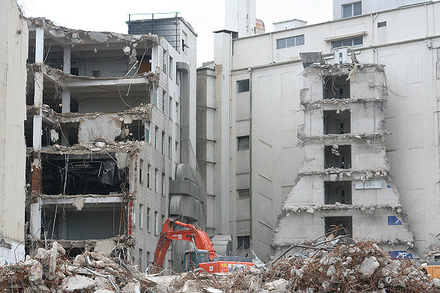 cdemski 0 Geschrieben 21. September 2007 Geschrieben 21. September 2007 Seit dem letzten Bild sieht es nun auch wieder ganz anders aus. Es heißt es nicht "Bagger hinter Glas" sondern eher "Bagger auf dem Glas / Schutt" Bei dem Abriss der Fassade ist ein Autokran im Einsatz, der wohl eine Platte oder eine Matte da vorhält, wo die Hydraulikzange gerade ansetzt. Damit soll wohl gesichert sein, dass die Glassplitter beim Abreißen nicht Richtung Straße bersten... Ciao Zitieren