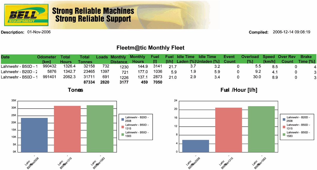 Bauforum24 1.439 Geschrieben 8. Februar 2007 Geschrieben 8. Februar 2007 Bereits auf der Bauma 2003 stellte Bell Equipment sein Fleetm@tic-Flottenmanagementsystem vor, das mit drei Leistungspaketen in der Datenaufbereitung allen Ansprüchen von Fuhrparkbetreibern gerecht wird. Das System erfreut sich großen Zuspruchs ? alleine 2006 konnte Bell Equipment einen 50%igen Anstieg an Betreiberverträgen verbuchen. Gerade auch stationäre Unternehmen mit überschaubarer Fuhrparkgröße profitieren laut Hersteller zunehmend von den Vorteilen, die Fleetm@tic in der lückenlosen Dokumentation der Betriebs- und Produktions-Historie bietet. Technische Voraussetzung des Fleetm@tic-Systems ist die Fahrzeug-Hardware, bestehend aus dem sogenannten Memory-Modul und dem Transmitter/Receiver. Die Hardware ist bei allen Bell-Knicklenkern identisch und kann als Option ab Werk oder als Nachrüstkit für alle Modelle der D-Serie eingebaut werden.Die Fleetmatic-Hardware nutzt insgesamt sechs Steuereinheiten, die bei einem knickgelenkten Muldenkipper den Motor, das Getriebe, die Cockpitanzeige, das Fahrwerk, die Onboard-Waage sowie die Kühlerlüftung überwachen. So liefert die Motor-Steuereinheit beispielsweise Daten zu Temperatur, Druck und Drehzahl und informiert über den Kraftstoffverbrauch und das Motordrehmoment. Die einzelnen Steuereinheiten sind in das Steuerungsnetzwerk der Maschine, das sogenannte CanBus, eingebunden. Das Memory-Modul lädt die CanBus-Rohdaten und speichert sie als Statusmeldungen. Hierzu zählen alle Motordaten mit Leistungsverlauf und Verbrauchswerten, Betriebsdaten aus Antriebsstrang und Bremsanlagen sowie Kippvorgänge und die über eine Onboard-Waage ermittelten Transporttonnagen. Nach wie vor ist Bell Equipment der einzige Hersteller, der die Onboard-Verwiegung bei Knicklenkern anbietet.Gemeinsam mit den ebenso kontinuierlich ermittelten GPS-Daten sendet der Transmitter die Datenpakete via Satellit an das zentrale Fleetm@tic-Rechenzentrum von Bell Equipment. Die Frequenz und der Umfang der Datenübermittlung sind dabei abhängig vom jeweils gewählten Fleetm@atic-Leistungspaket. Der Fleetm@tic-Server bearbeitet die gelieferten Daten und stellt sie auf eine Datenbank, auf die der Kunde über die Fleetm@tic-Software zugreift.Alle drei Fleetm@tic-Leistungspakete liefern dieselben Informationen, unterscheiden sich dabei jedoch in Meldefrequenz und Zugriffshäufigkeit. Die Basisversion Fleetm@tic Lite liefert zweimal täglich umfangreiche Datenpakete und erfasst damit gewissermaßen alle Informationen der letzten Schicht oder des zurückliegenden Arbeitstages. Fleetm@tic Std übermittelt die Rohdaten stündlich in bis zu 20 Datenpaketen täglich, Fleetm@tic Max liefert bis zu 200 Datenpakete pro Tag mit zusätzlichen Statusmeldungen beim Ein- oder Ausschalten der Zündung sowie bei Lade- und Entladevorgängen.Die übermittelten Datenpakete werden im Bell-Rechenzentrum aufbereitet, auf dem Fleetm@tic-Portal passwortgeschützt online bereitgestellt und je nach Leistungspaket in festgelegten Abständen als EDV-kompatible Formate (Excel u.ä.) oder als graphische Darstellung direkt an den Betreiber gesandt.Über das Fleetm@tic-Portal kann der Betreiber von jedem Internetzugang aus auf seine Maschinen zugreifen. Im Falle einer Fehlbedienung oder eines drohenden Ausfalls kann der Fahrer zudem per SMS auf das zentrale Kabinen-Display gewarnt werden. In der Online Abfrage auf dem Fleetm@tic-Portal sind Berichte als PDF-Dateien abrufbar - auf Wunsch werden Auswertungen auch im Excel-Format direkt zugesandt.(Grafik: Bell) Zitieren