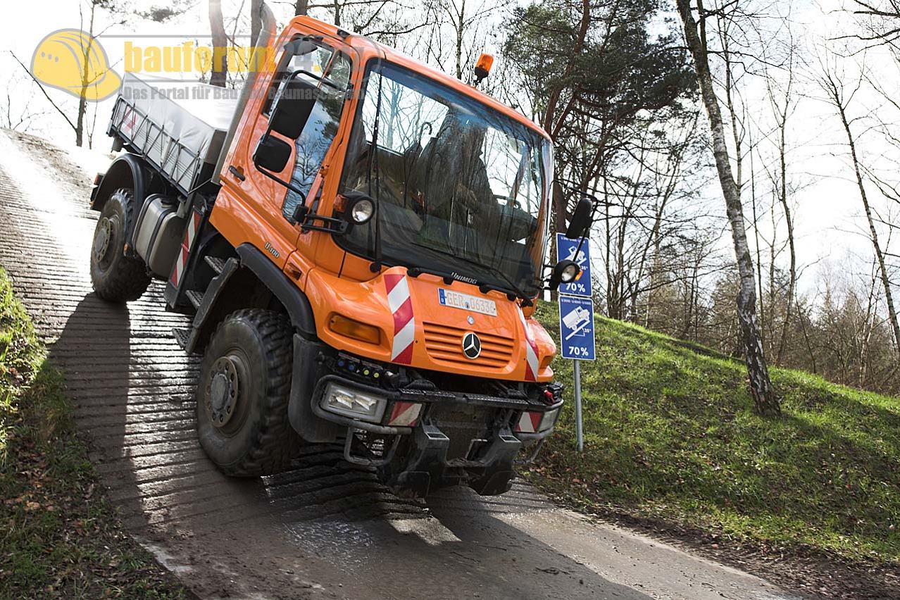 Auf dem Testgelände in Ötigheim stand die komplette Palette an Baufahrzeugen zum Test zur Verfügung. Hier fühlt sich insbesondere der Unimog heimisch der auf dem Testparcours zeigen kann was in ihm steckt. Neben dem hochgeländegängigen U 4000 (links) stand auch der Profi-Geräteträger U 500 (rechts) in Kommunalausführung zur Testfahrt bereit.