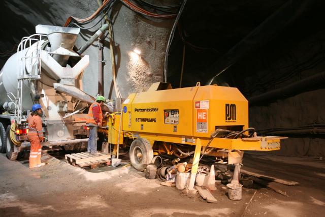 Bauforum24 1.491 Geschrieben 24. Juli 2007 Geschrieben 24. Juli 2007 Durch den Bau des Pumpspeicher-Kraftwerks Kops II mit einer Turbinenleistung von 450 MW erweitern die Vorarlberger Illwerke AG ihre Kapazitäten für den europäischen Strommarkt erheblich. Während des Ausbaus des Kavernenhohlraums erfolgen die umfangreichen Betonarbeiten in der riesigen Maschinenkaverne lediglich mit einer stationären BSA-Betonpumpe und nur einem stationären Betonverteilermast, der abwechselnd auf zwei Rohrsäulen betrieben wird. Gearbeitet wird im 3-Schicht-Betrieb, rund um die Uhr. Die Baukosten für das Kavernenkrafthaus und die Unterwasserführung werden auf ca. 30 Mio. ? veranschlagt. Die Arbeiten für das Kopswerk II begannen im September 2004, die Inbetriebnahme ist für 2008 geplant.Das neue Pumpspeicher-Kraftwerk befindet sich in der Nähe des Kopswerks I im Montafon und nutzt wie dieses ebenfalls das Wasser aus dem Kopssee. Das Projekt umfasst die Baulose 1 und 2 (Druckstollen, Wasserschloss und Druckschacht) sowie das Baulos 3 mit Maschinenkaverne und Trafohalle samt Nebenanlagen sowie der Unterwasserführung. Die Arbeiten am Baulos 3 werden von einer ARGE aus Beton- und Monierbau Gesellschaft m.b.H (Innsbruck), Alpine Mayreder Bau GmbH (Salzburg/Wals), Ed.Züblin AG Zweigniederlassung Tunnelbau (Stuttgart) unter Federführung der Jäger Bau GmbH (Schruns), durchgeführt. Die Maschinenkaverne gilt als wesentliches Bauwerk von Kopswerk II. Sie liegt ca. 150 m tief im Berg und ist über einen Zugangsstollen von der Silvrettastrasse zwischen Gaschurn und Partenen aus zu erreichen. Ihre Abmessungen sind mit 88 m Länge, 60,5 m Höhe und 30,5 m Breite äußerst beeindruckend. Im Januar 2006 begann der Ausbruch des riesigen Hohlraums im Sprengvortrieb, und zwar in einer Kalotten- und zehn Strossenebenen. Dabei wurde die Kalotte mit zwei Ulmenstollen und einem nachgezogenen Kern aufgefahren. Vier Lagen Baustahlgitter und pro Armierung ein ca.10 cm starker Auftrag aus Nassspritzbeton dienten zur Ausbruchsicherung. Die dauerhafte Sicherung des riesigen Hohlraums übernehmen zusätzlich zahlreiche, bis zu 32 m lange Vorspannlitzenanker. In der Maschinenkaverne münden u.a. die drei gepanzerten Turbinenzulaufstollen der Hochdruck-Verteilrohrleitung, durch die das Triebwasser über den Druckstollen und den Druckschacht aus 800 m Fallhöhe auf die Laufradschaufeln der Turbinen schießt. Der Ausbau der sechs Tiefgeschosse sowie der Montageebene erfolgt mit Ortbeton, insgesamt werden über 39.000 m³ Beton in der Maschinenkaverne verbaut. Bereits die Sohle der gewaltigen Felsenhalle und einzelne Decken sind bis zu 4 m mächtig, - die bis zu 8 m hohen Wände werden in Stärken von 0,2 bis 4,0 m ausgeführt. Aufgrund der Kavernenabmessungen wären für den gleichmäßigen Betoneinbau eigentlich zwei stationäre Betonverteilermaste erforderlich gewesen. Nach Rücksprache mit Ingenieuren der Putzmeister AG entschied sich die ARGE jedoch für die Installation nur eines Stationärmastes des Typs MX 28-4, der abwechselnd von zwei Rohrsäulen aus betrieben wird. Da die einzelnen Abschnitte pro Etage nie gleichzeitig errichtet werden, stört es den Ablauf der Arbeiten kaum, wenn das Armpaket des MX-Mastes von einer der Rohrsäulen gelöst, vom bereits installierten Portalkran angehoben, ans andere Ende der Kaverne verfahren und dort auf die zweite Rohrsäule aufgesetzt wird. Der gesamte Vorgang dauert jeweils ca. 30 Minuten, hinzu kommt das Lösen und Anschließen der Förderleitung, das ebenfalls in etwa einer ½ Stunde erledigt ist. Bis zu 360 m³ Beton werden pro Abschnitt eingebaut. Die Betonpumpe BSA 1408 E ist im Zufahrtsstollen aufgestellt und über eine ca. 150 m lange Förderleitung mit beiden Rohrsäulen des MX-Mastes verbunden.Auffallend am unballastierten Stationärmast MX 28-4 ist nicht nur die flexibel einsetzbare Z-Faltung des Armpakets, mit der einzelne Sohlenabschnitte der Turbinenzulaufstollen betoniert werden können. Ungewöhnlich ist auch die Gesamtlänge der beiden Rohrsäulen, von denen der Mast aus betrieben wird. Durch das Aufeinandersetzen mehrerer Rohhrsäulen (sie sind erhältlich in 4, 6 und 10 m Länge) passen sie sich dem Baufortschritt kontinuierlich an und erreichen in der Maschinenkaverne von Kops II im Endstadium eine Höhe von 40 m. Für zusätzliche Stabilität sorgen zwei Abspannungen der Rohrsäulen in Höhe von ca. 18 und 24 m, die in den entsprechenden Zwischendecken verankert sind.Den Beton erhält der Verteilermast von einer stationären PM-Betonpumpe, die mit dem MX-Mast und seinen beiden Rohrsäulen über eine etwa 150 m lange Förderleitung (DN 125) verbunden ist. Die BSA 1408 E wird von einem 75 kW E-Motor angetrieben und erreicht im stangenseitigen Betrieb eine Fördermenge von 79 m³/h bzw. 71 bar Betondruck (bodenseitig: 53 m³/h bzw. 106 bar). Der stationäre Putzmeister Betonverteleirmast MX 28 mit ?Z"-Faltung passt sich leicht den Platzverhältnissen in der Kaverne an und wird abwechselnd von zwei Rohrsäulen aus betrieben.Jeweils vier Maschinisten für den MX-Stationärmast und die BSA-Betonpumpe wurden von der österreichischen PM-Vertretung, Fa. Hans Eibinger (Söding), in die Bedienung der Maschinen eingewiesen. Eibinger-Servicepersonal hatte zuvor auch bei der Installation der Rohrsäulen und beim Aufsetzen des Betonverteilermastes mitgeholfen.Die benachbarte Trafokaverne hat mit 35 m Länge, 16 m Breite und 20 m Höhe zwar ebenfalls imposante Ausmaße, ist jedoch deutlich kleiner als die Maschinenhalle. Hier erfolgte der Betoneinbau in die Fundamente, Wandschalungen und Decken teilweise mit einer PM-Autobetonpumpe BRF 24-4.09 H, deren Verteilermast als ZR-Falter über die hier erforderlichen Schlupfeigenschaften verfügte. Das eingebaute Betonvolumen betrug ca. 2.200 m³. Seit November 2006 sind die Rohbauarbeiten in der Trafokaverne abgeschlossenAls Standardrezeptur wird ein Beton der Festigkeitsklasse C25/30 eingebaut, der auf dem Baustellenareal in ei