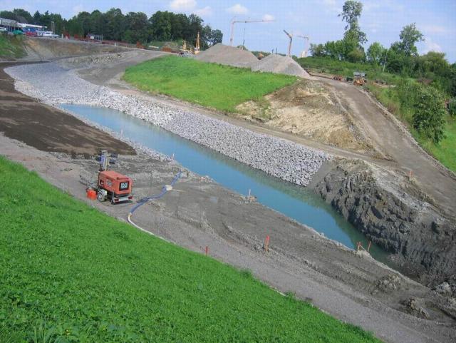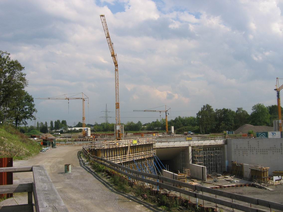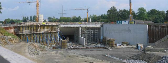 hero 0 Geschrieben 17. August 2011 Geschrieben 17. August 2011 Auslaufbauwerk des neuen Emscher-Durchlasses. Zu Zeit wird die linke Flügelwand und die Leitwände am Durchlass erstellt. Die Flügelwände haben eine dicke von ca. 2,00 m. Die Baugrubenspundwände hinter den Flügelwänden dienen als verlorene Schalung. Der Trenndamm trennt zur Zeit noch den neuen Zufluss zur alten Emscher. Das neue Emscher-Bachbett seitlich von der Trockendockbaugrube. Zitieren