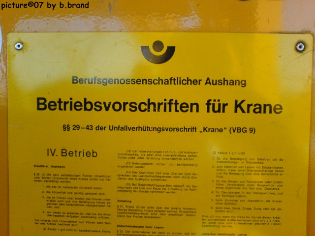 Gast Beat Geschrieben 15. Februar 2009 Geschrieben 15. Februar 2009 ...Lest mal die Bestimmungen die an jedem Kran angebracht sind... Meinst Du etwa dieses Schild, was jedenfalls früher in (fast) jedem Kran angebracht "wurde"? Werde Morgen versuchen ein besseres Bild von der ganzen Tafel zu machen. Doch so wie ich dies im Kopf habe ist da was in der Art wo Du hier sagst nicht geschrieben. Ich weis was Du meinst, doch das steht anders, und ich kann Morgen genau sagen was da steht. Es steht da nämlich nur was von: das ein Kran von einem sicheren Stand aus geführt werden muss. Doch wie gesagt, morgen weis ich es genau.Gruss Beat Zitieren