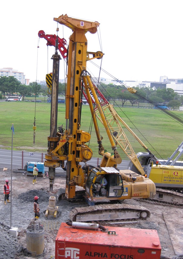 Die zu bohrenden Pfaehle uebersteigen in der Tiefe die Moeglichkeiten des Bohgerates. Deshalb kommt eine Verlaengerung zum Einsatz. Die Verlaengerung wird zunaechst mit einem Raupenkran in das Bohrloch abgetaeuft.