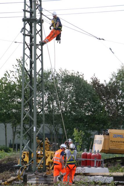 Colourconcept 7.724 Geschrieben 12. Juni 2009 Autor Geschrieben 12. Juni 2009 Noch schnell die letzten Bilder vom Pfingstwochenende, bevor es morgen auf der Baustelle mit dem 2.Teil des Abbruch weiter geht.Wenn die Schiene liegt, wird nachgemessen.... ...die Schrauben in die Schwellen gedreht... ...und die dann mit technischen Hilfsmitteln festgezogen Mitarbeiter der Firma ->Elpro installieren zwischenzeitlich auch wieder die Oberleitungen. Zitieren