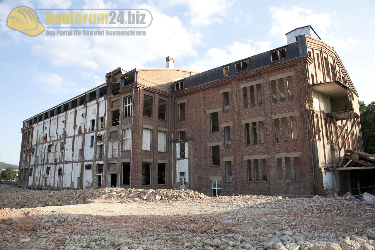 Bauforum24 1.491 Geschrieben 3. August 2009 Geschrieben 3. August 2009 Sprengung der ehemaligen Kammgarnspinnerei Niederschmalkalden in WernshausenAm Samstag, 1. August 2009, um 11 Uhr wurde der 80 Meter lange, 40 Meter breite und 35 Meter hohe Hochbau, die Spinnerei, gesprengt. Eurovias Sprengmeister Uwe Jacob und sein Team hatten etwa 1.900 Löcher gesetzt und diese mit rund 250 kg Sprengstoff gefüllt. Das Video der Sprengung gibt es auf Bauforum24 TV.Das vieretagige Gebäude wurde bei der Sprengung etwa einen bis 1,50 Meter Richtung Hof "gezogen". In jeder Etage wurden etwa 2 bis 2,50 Meter rausgesprengt. Der Rest blieb stehen und baute sich entsprechend nach oben auf. Nach der Sprengung war es möglich, mit mehreren Geräten gleichzeitig weiterzuarbeiten.Im Vorfeld wurde das Gebäude entkernt, nach Gasleitungen untersucht und alle Schadstoffe, wie künstliche Mineralfasern, entfernt.Die von Karl Behlert entworfenen und 1920 bis 1922 errichteten Fabrikgebäude östlich der Werra am Übergang zum früheren Wernshausener Ortsteil Niederschmalkalden standen seit 2002 unter Denkmalschutz, nachdem die Kammgarnspinnerei 1992 geschlossen wurde. Da Sanierung und Unterhalt zu teuer waren, wurde die Sprengung verfügt. Denkmalschützer und Anwohner protestierten immer wieder gegen den Abriss. Nun entsteht hier ein Industriegelände. Das Projekt Kammgarnrevitalisierung soll bis Ende des Jahres abgeschlossen sein. Die 1920 bis 1922 errichteten Fabrikgebäude wurden vor der Sprengung entkernt, nach Gasleitungen untersucht und alle Schadstoffe, wie künstliche Mineralfasern, wurden entfernt. Zitieren