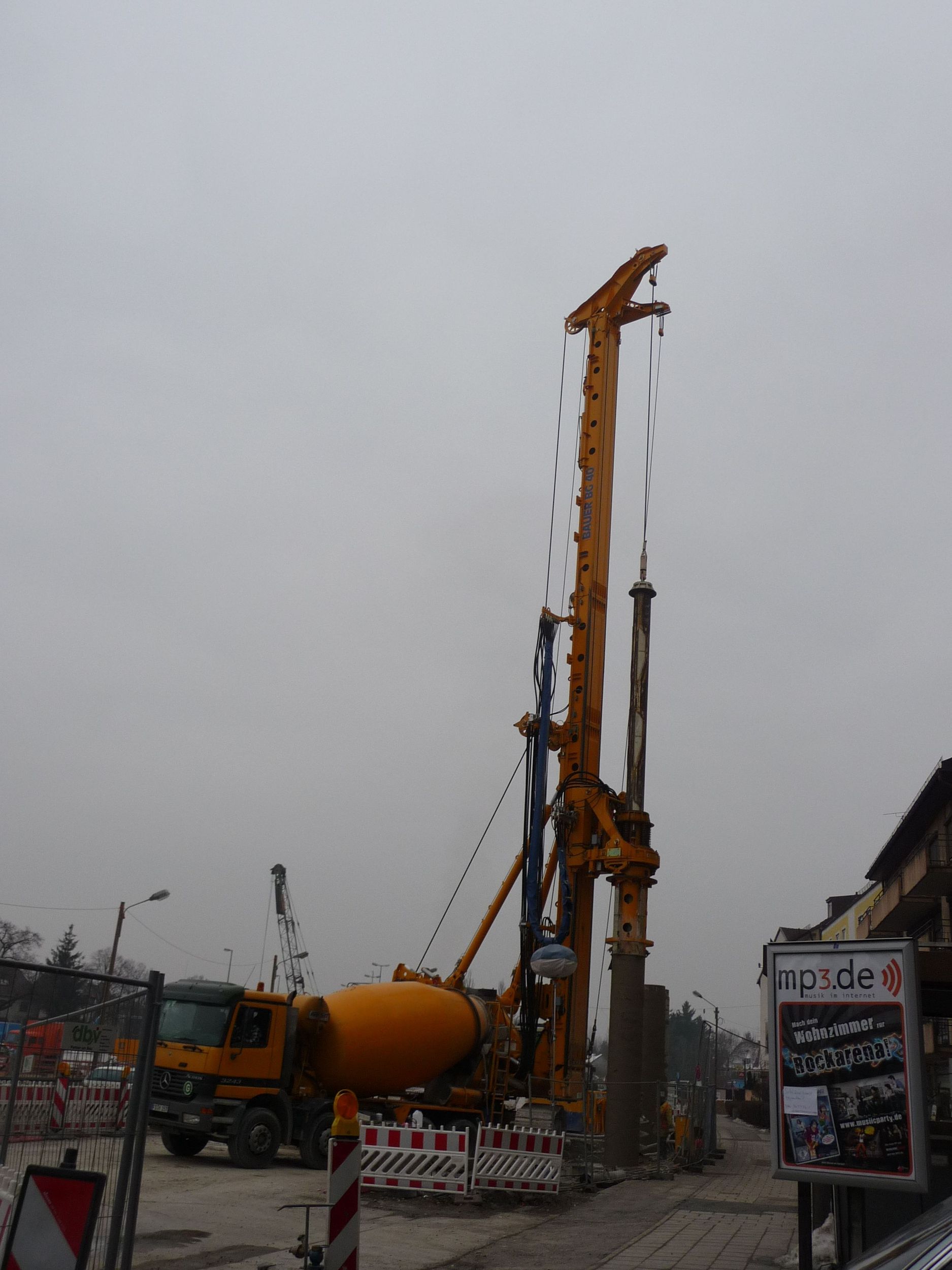 Simon T. 86 Geschrieben 31. Januar 2010 Geschrieben 31. Januar 2010 Das zurzeit interessanteste Baufeld aber schlecht zugänglich da hier die Fußgänger die Walchstadter und Staltacher Straße benützen müssen. Aber es gibt noch genügend Pfähle zu bohren Hier die Bernriederstraße. Auch hier zusehen die Ausbuchtung für Betriebsräüme.Vorort eine BG 40 und eine BG 28. Bauer BG 40 und links die BG 28Servicelader hier ein Volvo L60 oder 70F Eine Bohrpfahlbewehrung kommt geflogen Ein Hitachi CX 400 von Bauer Spezialtiefbau Für was die Ausbuchtung in der die BG28 steht ist kann ich leider nicht sagen.Von dem Standplatz der BG28 bis hinter zur Tankstelle kommt einen Rampe hin. Sodass wenn man im Tunnel Richtung Süden fährt auch in die Waldfriedhof/ Albert-Roßhaupter Straße fahren kann. Nochmal BG 40 mit nach vorne gekippten Mast bei Bohrpfahl betonieren.Um 16.00Uhr schon mit Licht. Aufwärmstelle. Bei den Temperaturen ist das genehmigt Zwischen der Waldfiedhofstraße und der Olympiastraße arbeitet die zweite BG40. Zitieren