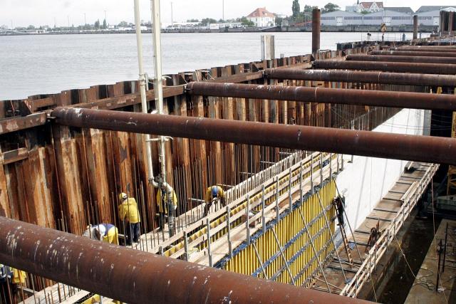 Bauforum24 1.488 Geschrieben 3. November 2009 Geschrieben 3. November 2009 Mit einer Investitionssumme von rund 235 Mio. Euro ist der Neubau der Kaiserschleuse in Bremerhaven aktuell das größte Infrastrukturprojekt dieser Art in Europa. Die Kaiserschleuse und die Nordschleuse bilden die einzigen Zufahrten zum Überseehafen von Bremerhaven. Gleichzeitig wird der Hochwasserschutz verbessert, ein neuer Vorhafen entsteht und am Eingang zur Schleuse ist der Neubau eines Schlepperhafens mit 10 Liegeplätzen für Schlepper bereits abgeschlossen. Die Cemex-Gesellschaft Transportbeton Bremerhaven GmbH & Co. KG beliefert dieses Bauprojekt mit insgesamt 45.000 m³ Transportbeton. Davon wurden bis August 2009 ca. 15.000 m³ eingebaut. 15.000 m³ Beton wurden bisher verbaut, weitere 30.000 m³ werden für die folgenden Bauabschnitte noch benötigtDie neue Anlage ersetzt ihre Vorgängerin aus dem Jahr 1897, die den heutigen Schiffsgrößen schon längst nicht mehr gewachsen war und wegen Instandsetzungsarbeiten immer wieder gesperrt werden musste. Sie hatte eine Länge von 240 m, eine Durchfahrtsbreite von 28 m und ging bis zu einer Tiefe von -9 m NN. Vor allem für die immer größeren Autotransporter, die Bremerhaven als einen Hauptumschlagplatz nutzen, war die alte Kaiserschleuse nicht mehr ausreichend. Sie mussten deshalb durch die Nordschleuse geleitet werden, die damit überlastet war. 2007 wurden hier zwei Millionen Autos umgeschlagen.Seit Herbst 2007 wird an der neuen Kaiserschleuse gearbeitet, die eine Länge von 305 Metern und eine Breite von 55 Metern erreichen wird. Sie reicht bis 13 m unter NN und ist auf Hochwasser von + 6,50 ausgelegt. Der Tidenhub der Weser beträgt an dieser Stelle rund vier Meter. Damit der Wasserstand in den Hafenbecken dennoch konstant bleibt, sind Häupter auf der Seite der Weser wie auch auf der Seite des Hafenbeckens erforderlich. Die Schleusenkammer wird seitlich durch Stahlspundwände ausgebildet, die mit einem Abschlussholm aus Beton versehen sind. Hubschiebetore ? statt der alten Stemmtore - sorgen dafür, dass der Wasserstand innerhalb der Kammer geregelt werden kann. Später werden die Schleusentore gleichzeitig als Zufahrten über die Schleusenhäupter dienen, was den Verkehrsfluss an dieser Stelle des Hafengebiets wesentlich verbessern wird. Eine 52 m-Pumpe bringt den Beton direkt zur Einbaustelle.Die Lieferungen aus dem nahegelegenen Cemex-Werk starteten mit Transportbeton für die Unterwasserbetonsohle, die die in den Untergrund gebohrten Stahlpfähle zur Auftriebssicherung der Sohle umschließt. Diese Unterwasserbetonsohle ist ca. 1,50 m stark, darauf aufbauend der Beton für die drei Meter starke Sohle. Mit Hilfe einer Zwischenpumpe, einer ca. 100 m-Rohrleitung und mobilen 52 m-Mastpumpe gelangte der Beton an die Einbaustelle. Zeitweise mußten 100 m³ pro Stunde angeliefert werden.?Drempel und Toranschlagpfeiler des Außen- und Binnenhauptes werden fugenlos als monolithisches Bauteil als Konstruktionsbeton C 35/45 mit CEM III/A 42,5 N ausgeführt", berichtet Michael Max, Bauleiter für die Betonarbeiten bei der Arge Kaiserschleuse. ?So halten sie den hier besonders hohen Beanspruchungen dauerhaft stand."Für die 2,50 bis 7,50 m dicken Wände der Torkammern, die die Schiebetore im geöffneten Zustand aufnehmen, wurde ebenfalls Konstruktionsbeton C 35/45 mit CEM III/A 42,5 N geliefert. Da es sich um sehr massige Bauteile mit deshalb zwangsläufig höherer Wärmeentwicklung handelt, wurde eine Rezeptur mit relativ geringem Zement- und hohem Flugascheanteil entwickelt, um die Kerntemperatur niedrig zu halten. Dennoch machten die hohen Außentemperaturen an einigen Sommertagen weitere Maßnahmen notwendig: Die Zuschläge und der Fahrmischer wurden gekühlt und der Zement in Silos kühl gelagert bis er benötigt wurde. Für den kammerseitigen Bereich der Wände, wo stärkerer Abrieb durch den wechselnden Wasserspiegel gegeben ist, wurde Splittbeton verwendet. Für die stark bewehrten Poller auf beiden Seiten der Schleuse, an denen später die Schiffe festmachen, wurden je Poller ca. 10 bis 15 m³ als C 35/45 geliefert. Das Maschinenhaus für den Torantrieb des Außenhaupttores wurde Ende August 2009 begonnen. Ende 2009 folgen dann das Maschinenhaus beim Binnenhaupt und der Steuerstand an der östlichen Schleusenkammer. Betonabschluß an der Spundwand der 300 m langen Schleusenkammer.?Bei großen Betonagen ist immer einer unserer Kollegen vor Ort", berichtet Thorsten Hein, Gebietsleiter Vertrieb von der Transportbeton Bremerhaven GmbH & Co. KG in Bremerhaven. ?Wir gewährleisten damit einen reibungslosen Ablauf, auch wenn der Bauleiter oder Polier gerade an anderer Stelle benötigt wird." Nach jetzigem Stand werden die Bauarbeiten Ende 2010 abgeschlossen sein.Mehr Meldungen zu aktuellen Bauprojekten... Videos: Bilfinger Berger "Schleuse Rothensee" und Strabag "Schleuse Oslebshausen" auf BF24 TV Fotos: Abriss Kaiserschleuse Bremerhaven durch Beelen Abbruch externer Link: www.cemex.de(Fotos: Cemex) Zitieren