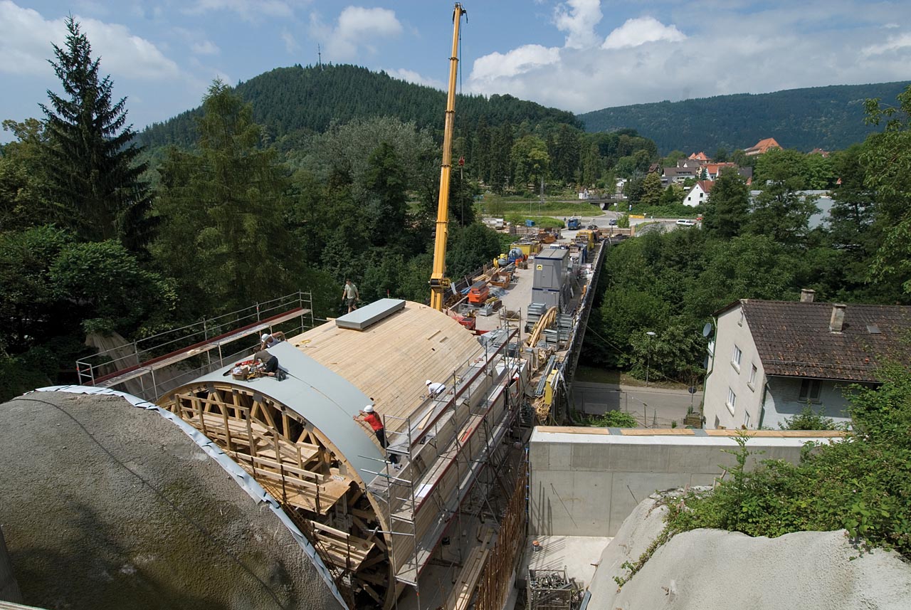 Bauforum24 1.491 Geschrieben 20. November 2009 Geschrieben 20. November 2009 Die Umgehung der Kernstadt von Neckargemünd ist das umfangreichste Projekt an einer Kreisstraße in der Geschichte des Rhein-Neckar-Kreises ? seit 1999 wird hier gearbeitet. Von Rainbach kommend soll die K 4200 den Verkehr aus der historischen Altstadt von Neckargemünd aufnehmen und an die B 45 übergeben. Der Tunnel durch den Hollmuthberg und unter der Wiesenbacher Straße hindurch ist das in bautechnischer Hinsicht anspruchsvollste Teilstück des ehrgeizigen Straßenbauprojekts. Montage der Tragkonstruktion aus NOEtec Trägern.Der Tunnel teilt sich in einen im Westen liegenden ca. 200 Meter langen bergmännischen Abschnitt und in einen im Osten liegenden etwa gleich langen Abschnitt in offener Bauweise. Der bergmännische Tunnelabschnitt liegt zu 2/3 im festen Sandstein und zu 1/3 im weniger standfesten Lockergestein. Er unterquert mit geringer Überdeckung den Randbereich der Kernstadtzone von Neckargemünd. Gebaut wurde wegen der geologischen Bedingungen von beiden Seiten. Montage des NOEtec Schalwagens unter beengten Platzverhältnissen.Ausbruch- und SicherungsarbeitenIm Westen musste das feste Gestein mittels eines Sprengvortriebes gelöst werden. Im Osten galt es, wegen des dort vorhandenen Lockergesteins und der vorhandenen Bebauung, den Tunnelbau äußerst setzungsarm vorzutreiben. Bevor hier mit dem Bau des eigentlichen Tunnels begonnen werden konnte, wurden zwei Rohrvortriebe von der bergmännischen Anschlagwand bis zum Fels vorgetrieben. Sie dienten u.a. dazu, der späteren Tunnelschale ein festes Auflager zu bieten. Erst danach wurde der Tunnelquerschnitt etappenweise ausgebrochen und mit Spritzbeton vorläufig gesichert. NOEtec Schalwagen kurz vor dem ersten Einsatz.Selbstfahrender NOEtec SchalwagenZur Erstellung der endgültigen Tunnelschale hatte das ausführende Bauunternehmen, die Firma Baresel aus Stuttgart, gemeinsam mit dem technischen Büro von NOE den ersten selbstfahrenden NOEtec Schalwagen für einen Tunnelbau im bergmännischen Verfahren konzipiert. Sein Aufbau erfolgte mit Elementen aus dem Systembaukasten von NOEtec. Gegenüber einem konventionellen Stahl-Schalwagen soll sich die Aufbau- und Montagezeit um ca. 50 % reduzieren lassen. Der NOEtec Baukasten besteht aus nur wenigen Systemteilen ? Träger, Streben, Verbindungsschlösser und Bolzen ? die sich schnell montieren lassen sollen. Das flexible System bietet für viele Schalaufgaben im Ingenieurbau eine Lösung. Montage der Schalhaut auf den NOEtec Schalwagen.Prototyp aus dem SystembaukastenDer für eine Taktlänge von 10 Metern konzipierte NOEtec Schalwagen läuft ? aufgrund der unterschiedlichen Sohlgeometrien ? auf den Banketten. Hierzu wurde eine zusätzliche Fahrwerksunterkonstruktion erforderlich. Das Fahrwerk selbst ist mit Elektromotoren ausgestattet, mithilfe derer sich die Konstruktion als Ganzes verfahren lässt. Das darauf aufbauende Traggerüst aus NOEtec Trägern ist so ausgelegt, dass alle Last in die Bankette abgetragen wird. Der 12 Meter lange Schalwagen ist so konstruiert, dass zum Reinigen die Schalelemente seitlich und oben um jeweils 50 Zentimeter zurückgefahren werden können ? ein ausschlaggebendes Argument für den Einsatz bei der Untertunnelung des Hollmuthbergs. NOEtec Schalwagen in Betonierposition.Noch sind die Arbeiten im Gang. Mithilfe des selbstfahrenden NOEtec Schalwagens können pro Woche zwischen zwei und drei Takte gefahren werden, sodass die 24 Takte nach kaum mehr als drei Monaten betoniert und die Tunnelschale im geplanten Zeitraum fertig gestellt sein wird. Betonverteiler im NOEtec Schalwagen.Dass man bei Baresel mit dem NOEtec Schalwagen gut arbeitet zeigt die Tatsache, dass das Bauunternehmen bereits bei Folgeprojekten mit den NOEtec Schalwagen plant. Die NOEtec Trägerschalung für den Ingenieurbau ist so flexibel, dass ein späterer Umbau auf andere Tunnel-Querschnitte jederzeit möglich ist. Betonverteiler im NOEtec Schalwagen.Mehr Meldungen aus der Baubranche... & Jobreport: Altstadttunnel Neckargemünd (BW) Herstellerlink: www.noe.de(Fotos: NOE-Schaltechnik) Zitieren