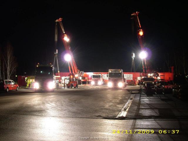 Gast Kränchen Geschrieben 24. November 2009 Geschrieben 24. November 2009 Heute wurde auf dem Aussengelände des bekannten Anlagenbauers ein Brückenkran aufgestellt.Er ist ca. 22 Meter hoch, hat ein Spannweite von 40 Meter und hebt 110 tonnen.Laut Lastanzeige der Krane hat der Brückenkran ein Eigengewicht von ca. 150 tonnen, allerdings ist das Windenwerk und weitere Bauteile noch nicht montiert.Ein großes Dankeschön an IAG Magnum und Wagenborg S&G, die das fotografieren möglich machten.Leider mußte ich am Nachmittag das fotografieren abbrechen, wegen dem sehr schlechten Wetter.Informative Links: http://www.iag-magnum.de/http://www.sg-logistik.de/Nun die Bilder Der Aufbau der beiden Terex Demag AC 500 begann bereits um 06.00 Uhr Zitieren