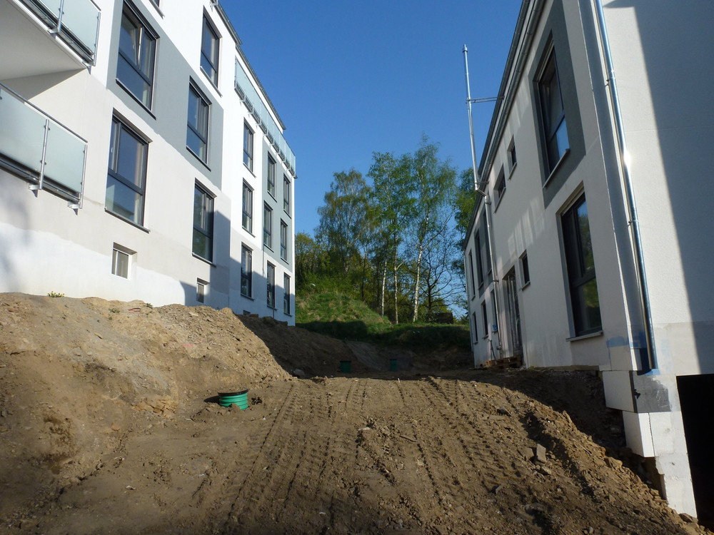 Bosouth_IT 79 Geschrieben 19. April 2020 Geschrieben 19. April 2020 Der Neubau in Weitmar wird wohl bald fertiggestellt sein. Weitere Arbeiten mit Stand vom 17.04.2020 Am Haus 1 wurden die Scheiben in die Balkongeländer eingesetzt, wobei im Erdgeschoss vorne rechts eine Scheibe fehlt. Spannungsschaden beim Einsetzen? 🤔 😆 🤭 Vorne zwischen den Häusern wurde auch wieder ausgeschachtet. Im folgenden Bild leider im Schatten liegend und nicht so gut wie in der Realität erkennbar, wurden im Zwischenraum der beiden Häuser weitere Sickerschächte gesetzt. Wahrscheinlich dient die im Bild zuvor gezeigte Ausschachtung dann zum Anschuss an eine Gesamtentwässerung. Haus 2 Das Gerüst wurde nun komplett abgebaut. Die Scheiben für die Balkongeländer sind jedoch noch nicht eingesetzt. An der Vorderseite erhält Haus 2 wohl keinen hellgrau abgesetzten Farbakzent. Auch der Schornstein an Haus 2 wurde nun fertigmontiert. Haus 2 noch einmal aus einer anderen Perspektive (hinter Haus 1 - solange das noch möglich ist) An der Grundstücksgrenze nach rechts wurde neben Haus 2 ebenfalls ein Entwässerungsschacht gesetzt. Direkt an der Grenze wurde zudem ein weitere Ausschachtung neben der Grundstückgrenze ausgeführt. Ich würde mal vermuten, dass hier noch ein Sammler erstellt wird, der Regenmassen auf dem von links oben abfallenden Gelände ein wenig auffangen könnte, bevor es in die Kanalsiation geht. Jedefalls sind zwei reguläre Sinkkästen direkt rechts vor der Ausschachtung vorhanden. (Leider nicht fotografiert, sorry). Zitieren