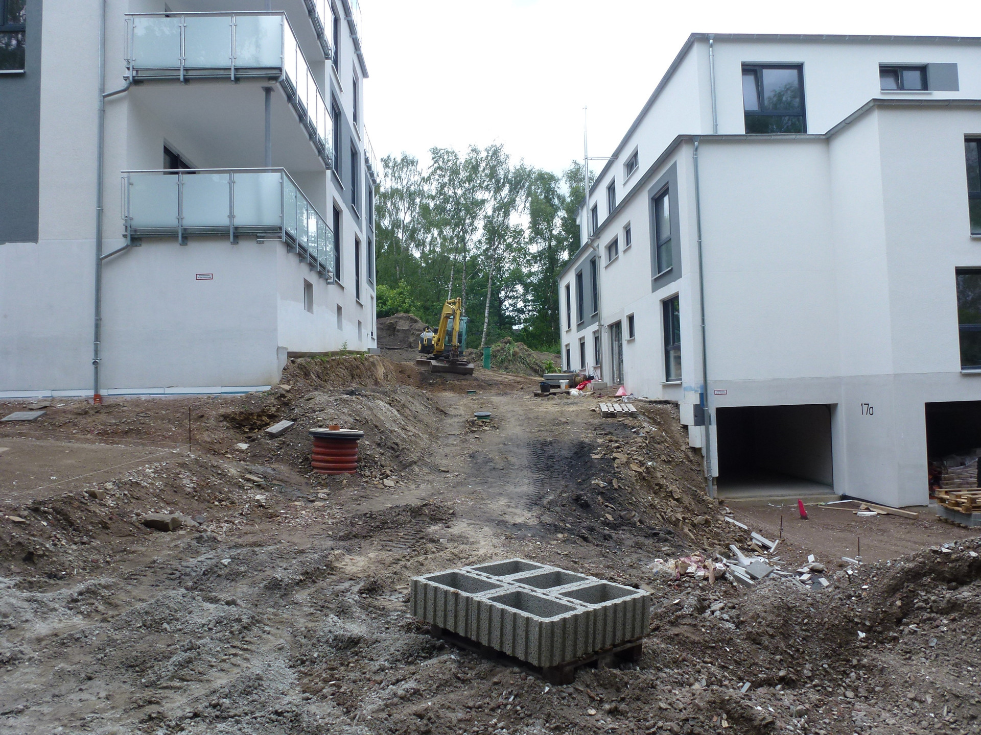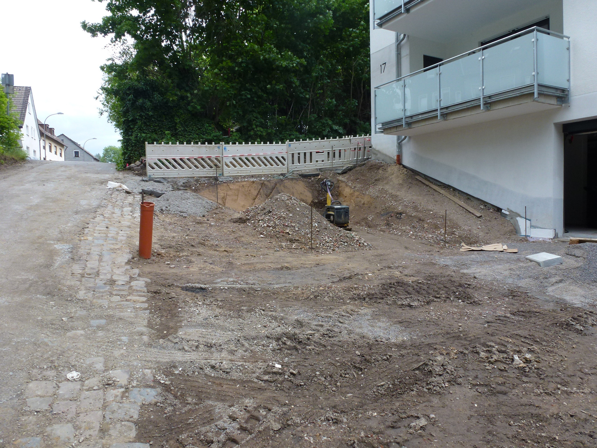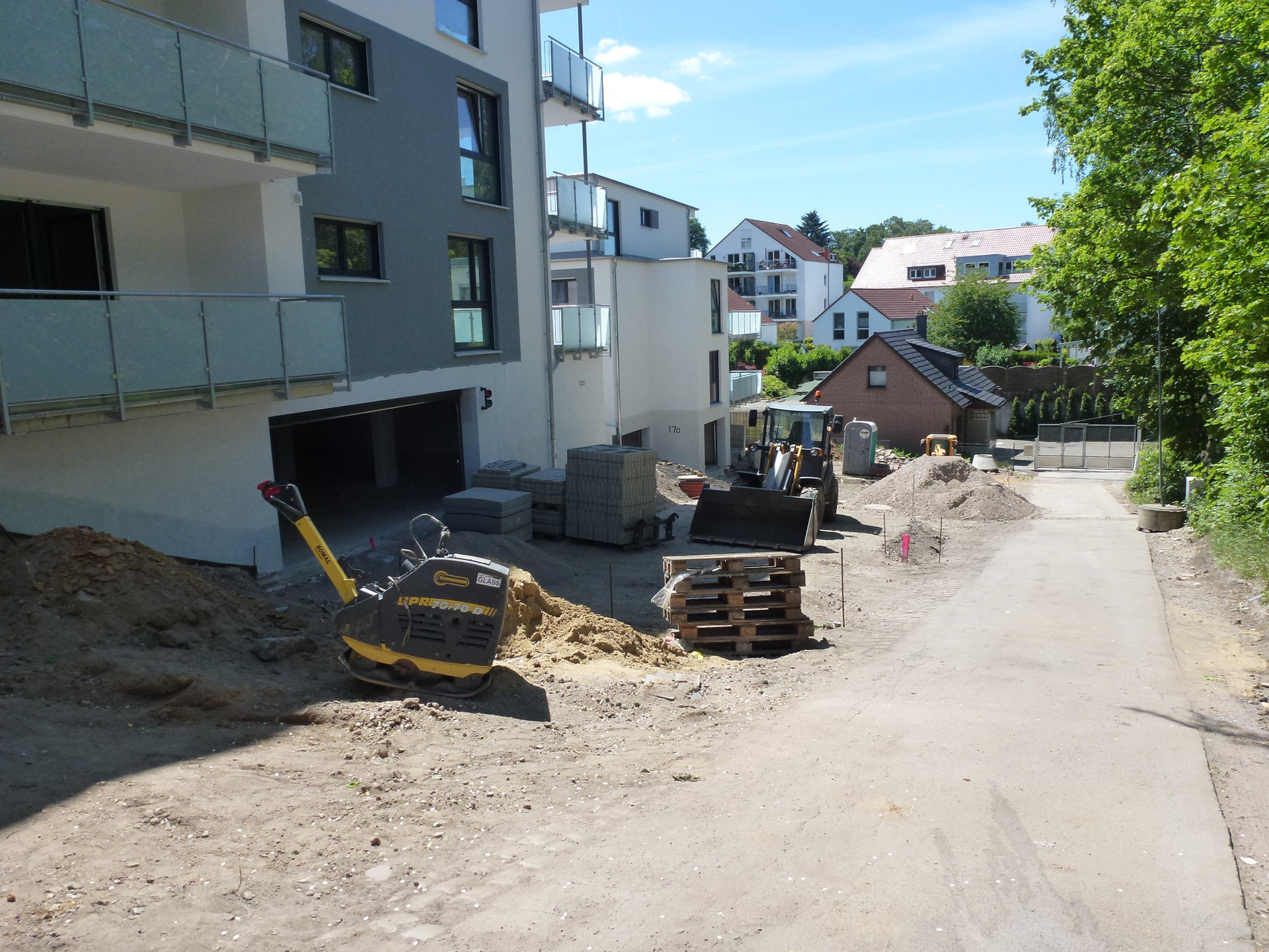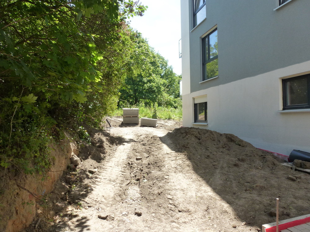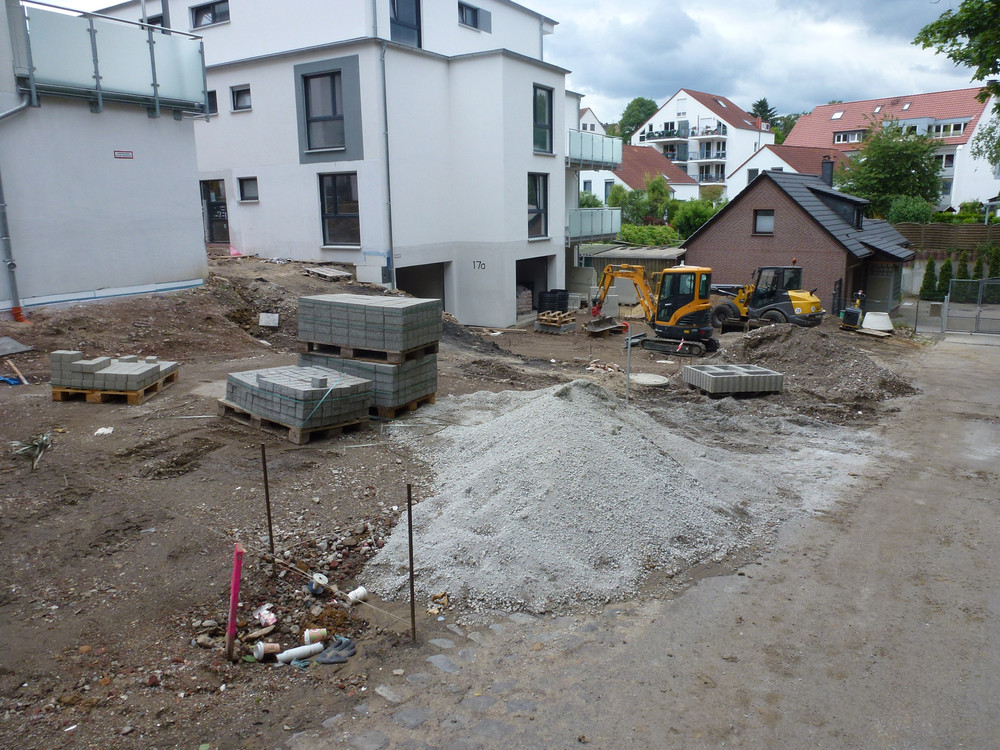 Bosouth_IT 79 Geschrieben 7. Juni 2020 Geschrieben 7. Juni 2020 Stand vom 07.06.2020 An der Zuwegung zu Haus 1 wurde mit der Pflasterung begonnen. Linkerhand wurden Pflanzsteine als Stützmauer gesetzt und mit Erde aufgefüllt. Unterhalb der Zuwegung zu Haus 1 wird in der Hanglage wohl ein weiterer Parkplatz vorbereitet. Auf dem Platz der bereits vorbereiteten Parkplätze werden aktuell die Pflastersteine gelagert. Wahrscheilich die Restlichen für die Zuwegung von Haus 1. Im Vordergrund die eingesetzten Pflanzsteine in der Zuwegung für Haus 1. Auch im Zwischenraum von Haus 1 und Haus 2 wurde wieder Erde im HIntergrund bewegt . Die Bodenmiete hinter Haus 1 schrumpft merklich. In die Erdgeschosswohung zur Terrasse hin ist tatsächlich schon Jemand eingezogen... Mal sehen, wie lange man da noch Fotos machen kann.. Vor Haus 2 wurde auch ein wenig die Fläche bearbeitet, wobei hier anscheinend ein Bauschutt-Depot sich bildet. Nein, die Bagger waren nicht an - Dürfte wohl mein automatischer Blitz gewesen sein / oder ein sonstiger Lichtreflex... Ich vermute, dass die L-Steine (vor der rechten Garage) erst gesetzt werden, wenn die Bodenmiete hinter den Häusern abgeräumt ist ... Zitieren
