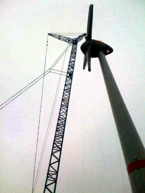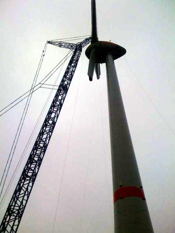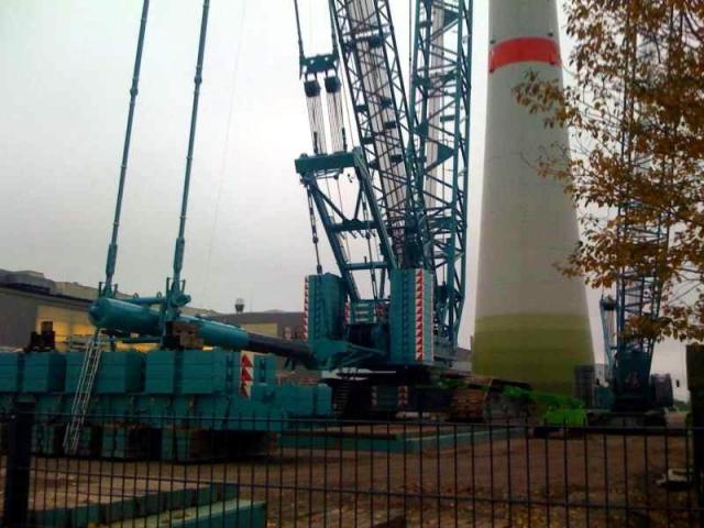 Bach_87 0 Geschrieben 17. November 2010 Geschrieben 17. November 2010 Anbei der CC9800 beim 350t Hub an einer E 126 in Magdeburg- Rothensee.Direkt auf dem Enercon Werksgelände.Sorry für die schlechte Quali der Bilder.(die Fotos sind von heute)Wie man sieht wurde die Nabe inklusive der Stahlsegmente der Rotorblätter gehoben, die GFK Enden folgen in den kommenden Tagen.Das Maschinenhaus war ein separater Hub. Zitieren