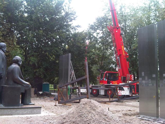 Bauforum24 1.491 Geschrieben 10. März 2011 Geschrieben 10. März 2011 Mit Hilfe von drei Terex Kranen versetzte Krandienst Werner die Denkmalanlage ?Marx-Engels-Forum" in Berlin Mitte. Der temporäre Umzug wurde wegen des Baus der U-Bahnlinie U55 erforderlich. Das aus einem Terex AC 200-1, AC 100/4 und AC 30 City bestehende Krantrio bewältigte den Einsatz laut Terex Cranes schnell und effizient. Die Denkmalanlage bildete eine kreisrunde Fläche von 60 Metern Durchmesser, in deren Mitte bis zum Umzug eine Bronzefigur von Karl Marx mit einer Höhe von 2,77 Metern und eine weitere von Friedrich Engels mit einer Höhe von 3,07 Metern standen. Das Gewicht der Bronzefiguren liegt bei jeweils rund 2,5 Tonnen. Dahinter befanden sich zudem mehrere Steinskulpturen aus kubanischem Marmor mit einem Gewicht von bis zu 12,5 Tonnen welche ebenfalls versetzt werden mussten. Den Terex AC200-1 setzte das Team vom Krandienst Werner ein, um die 12 Tonnen schweren Steinskulpturen mit einer Ausladung von 28 Metern zu heben. Pro Hub benötigte der Kran dazu lediglich jeweils zwischen einer und zwei Stunden. Der Terex® AC100/4 kam bei den 2,5 Tonnen schweren Bronzefiguren zum Einsatz. Die Herausforderung hierbei: Die beiden Figuren mussten in einem Radius von 50 Metern über einen Baumbestand gehoben werden. Eine Aufgabe, die der Terex AC100/4 laut Hersteller mit seinem fünfteiligen Teleskop-Ausleger problemlos und schnell bewältigte ? in weniger als drei Stunden konnte das Team jeden Hub bewältigen. Damit sich die Figuren während des Hubs nicht verdrehen konnten, waren sie an Händen und Füßen mit Gurten an einem Metallgerüst befestigt. ?Bei der Fahrt zum Einsatzort gerieten wir mit unserem Terex® AC 100/4 in eine Verkehrskontrolle der Polizei, der wir wegen des technisch einwandfreien Zustands und der kompakten Bauweise des Krans selbst für städtische Straßenverhältnisse aber gelassen entgegenblickten", berichtet Detlef Werner, Geschäftsführer der Montage- und Kranservice Werner GmbH . Nach eingehender Prüfung erhielt der All-Terrain-Kran dann auch wie erwartet die offizielle Freigabe für den Berliner Straßenverkehr: Alle verkehrstechnischen Anforderungen wie beispielsweise die zulässige Achslast wurden uneingeschränkt erfüllt, so dass sich der Terex® AC 100/4 auf den Weg zum Einsatzort machen konnte. ?Dank der vier lenkbaren Achsen ließ sich der wendige Kran dabei problemlos durch den Großstadt-Dschungel zum Marx-Engels-Forum dirigieren", erklärt Kranführer Kurt Grüner. Der neue Standort des Marx-Engels-Forums ist nur rund 80 Meter vom alten Platz entfernt. ?Der Wiederaufbau der Denkmalanlage ging ebenso problemlos vonstatten wie die Demontage. Dieser Einsatz hat uns wieder einmal gezeigt, dass wir mit unseren Terex®-Kranen alle Aufgaben zuverlässig, schnell und damit letztendlich wirtschaftlich für unsere Kunden lösen können", betont Detlef Werner. Er muss es wissen, schließlich fährt er all seine sechs Terex Krane auch selbst. Zitieren