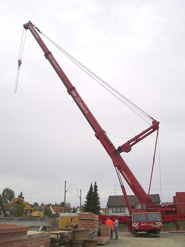 Gast longfront 321 Geschrieben 16. Mai 2005 Geschrieben 16. Mai 2005 (bearbeitet) Hallo Gestern wurde in Gaimersheim die neue Unter- (oder Über-) führung eingehoben. Zum Einsatz kam ein Demag AC 1600. Ich bin mir nicht sicher, aber ein Bahnarbeiter sagte, es sei ein 500 Tonner.Der Kran wird morgen abgerüstet, ich werde Fotos machen.Danke hierbei an einen Tipp, ohne den ich den Kran nicht entdeckt hätte Hier die Bilder. Kranbetreiber ist die Firma Markewitsch aus Nürnberg.#1 Der Kran von weitem. bearbeitet 16. Mai 2005 von longfront 321 Zitieren