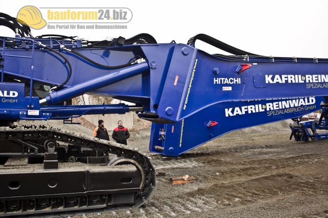Bauforum24 1.491 Geschrieben 11. November 2011 Geschrieben 11. November 2011 Am 10. November 2011 nahm Kafril & Reinwald den größten Abbruchbagger in Deutschland in Betrieb. Mit dem Hitachi ZX 870-3 XXL kommt erstmalig in Deutschland ein Abbruchgerät mit 3 Tonnen Nutzlast bei 50 m Reichhöhe zum Einsatz.Bauforum24 war in der Nähe von Leipzig und nahm an der Übergabe des beeindruckenden Gerätes teil. Hitachi ZX 870-3 Abbruch, mit hydraulischem Verstellausleger Zitieren