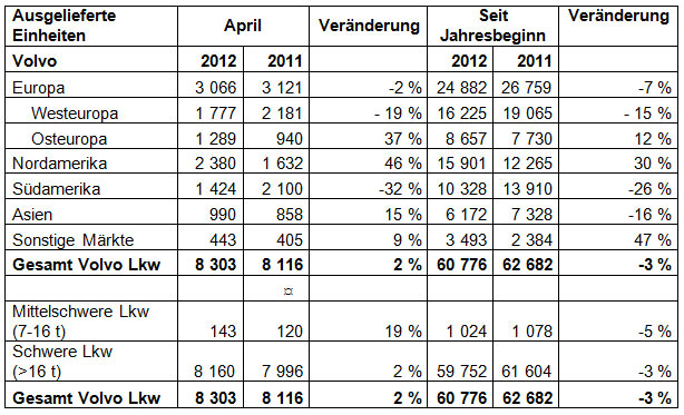 Bauforum24 1.491 Geschrieben 4. September 2012 Geschrieben 4. September 2012 Die weltweiten Auslieferungen von Volvo Trucks sind im Juli im Vergleich zum entsprechenden Vorjahreszeitraum um 2 % auf 8.303 Fahrzeuge gestiegen. Die Auslieferungen in Westeuropa gingen um 19 % zurück. Die schleppende makrowirtschaftliche Entwicklung und die Unsicherheit bezüglich des Geschäftsklimas in der Zukunft beeinträchtigen die Nachfrage. In Russland und in der Türkei zeigt sich weiterhin eine gute Nachfrage. Bauforum24 TV: Volvo Ocean Race 2012 in LorientIn Nordamerika stiegen die Auslieferungen im Juli im Vergleich zum entsprechenden Vorjahresmonat um 46 % auf 2.380 Fahrzeuge. Mehr Produktionstage in diesem Juli sowie weniger Schwierigkeiten bei den Zulieferern trugen zu diesem Anstieg bei. Volvo Trucks - eine Sparte der Volvo Group.Die Auslieferungen von Volvo Trucks in Südamerika sanken in diesem Juli im Vergleich zum Juli 2011 um 32 % auf 1.424 Lkw. Der Übergang zu neuen Emissionsvorschriften, die die Euro V-Technologie erforderlich machen, sowie die Konjunkturschwäche in Brasilien wirken sich weiterhin negativ auf die Nachfrage aus. Auslieferungen nach Marktbereichen: Übersicht der von Volvo Trucks ausgelieferten LKW Fahrzeuge 2011 und 2012. Herstellerwebseite: Volvo Trucks Germany Hersteller Informationen: Volvo Construction Equipment Firmenprofil(© Fotos: Volvo Trucks)Mehr News aus der Baubranche... Bauforum24 TV: Video über den neuen Volvo Dumper A40F FS Zitieren