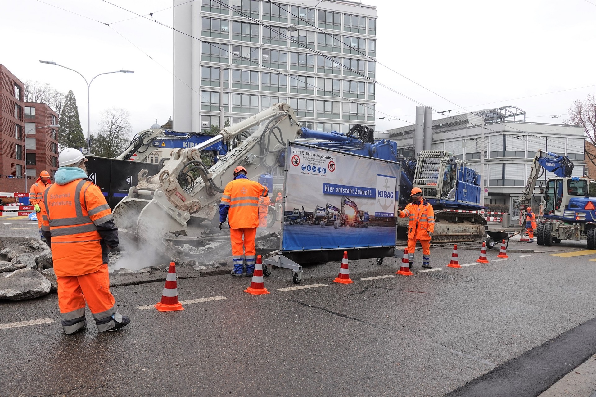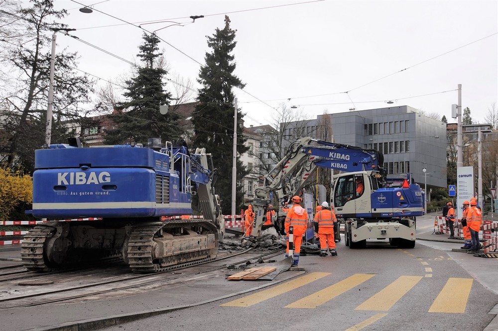 leon98 2.792 Geschrieben 27. März 2021 Geschrieben 27. März 2021 (bearbeitet) Die Verkehrsbetriebe der Stadt Zürich (VBZ) schreiben den Rahmenvertrag für Gleisabbruch regelmässig neu aus, und der Zuschlag geht jeweils an Eberhard oder die Kibag. Die letzten fünf Jahre war Eberhard am Zug, die nächsten Jahre übernimmt diese Arbeit wieder die Kibag. Den Auftakt machte heute ein Gleisabbruch beim Universitätsspital. Es wurde nur ein kurzes Stück stark abgenutzter Tramschienen im Bereich der Haltestelle Platte ausgewechselt, der alte Unterbau bleibt bestehen. Entsprechend waren auch "nur" vier Bagger im Einsatz: Der Hitachi KMC 600-6, welcher für die künftigen Gleisabbrüche auf 2-Steg Platten umgerüstet wurde, ein Cat M 318F, Liebherr A 918 compact und Takeuchi TB 295W. Ende Mai folgt dann ein grösserer Gleisabbruch, mit deutlich grösserem Maschineneinsatz. bearbeitet 27. März 2021 von leon98 6 Zitieren