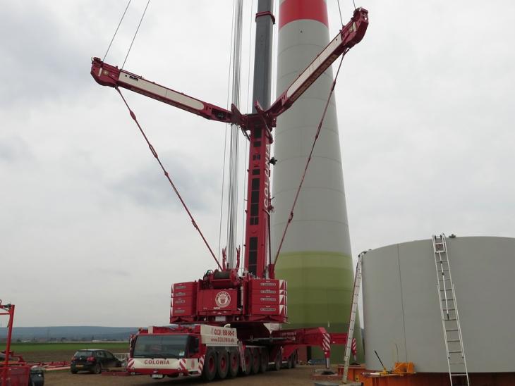 catkom70 3.281 Geschrieben 17. Oktober 2013 Geschrieben 17. Oktober 2013 Durch Zufall bin ich diese Woche auf eine Baustelle bei Düren-Echtz gestoßen, wo ein neuer Windpark gebaut wird. Insgesamt werden dort 6 Windkraftanlagen vom Typ Enercon E101 mit einer Nabenhöhe von 135 Meter errichtet.Im Einsatz ist dort u.a. auch ein 9-achsiger Liebherr 750 Tonnen Teleskopkran von Colonia.Liebherr LTM 1750-9.1 1 Zitieren