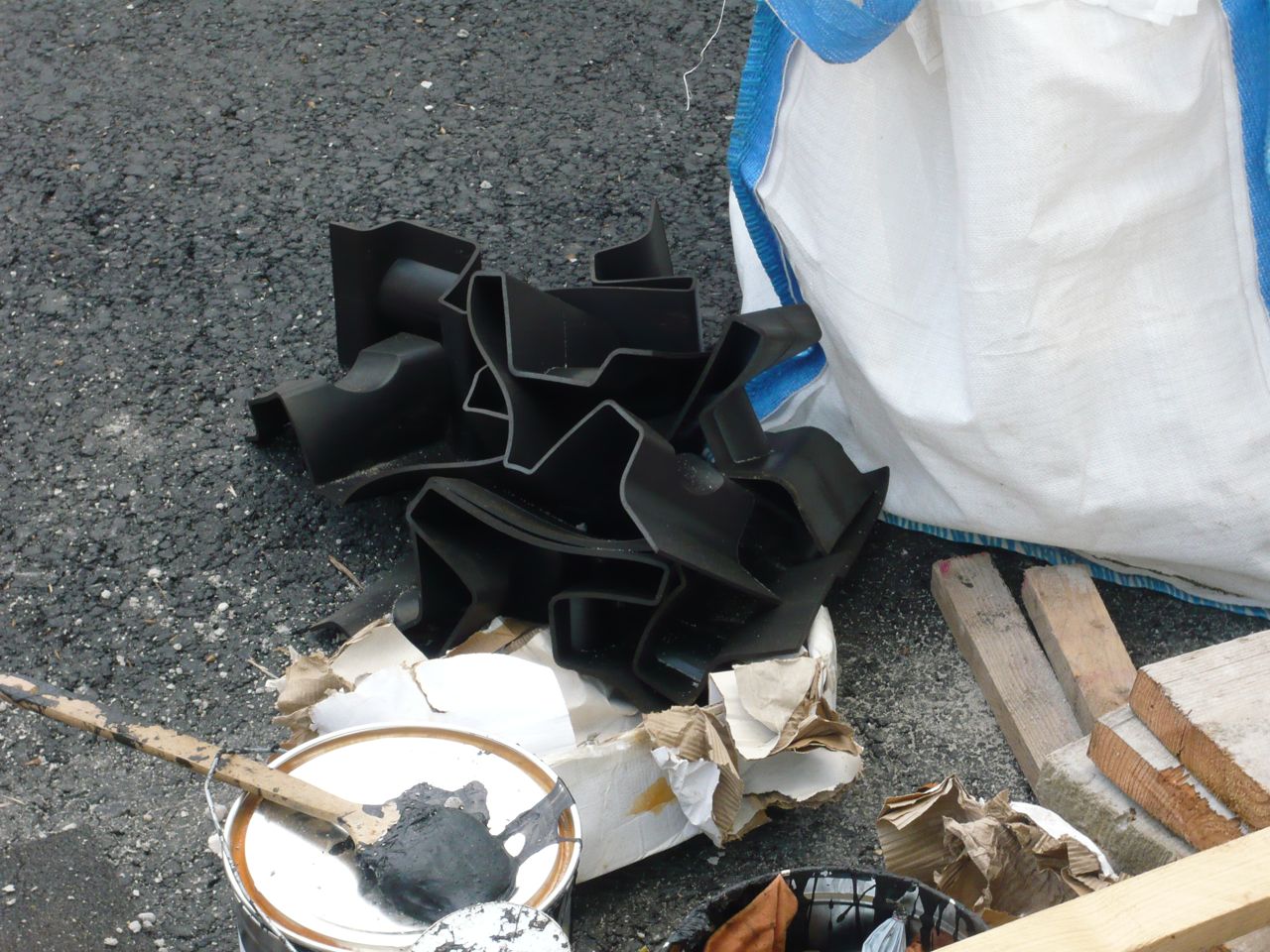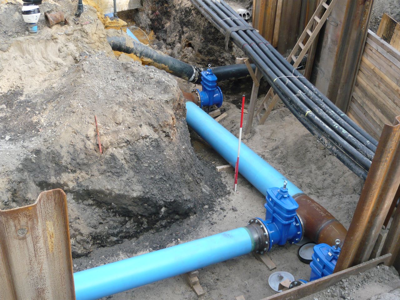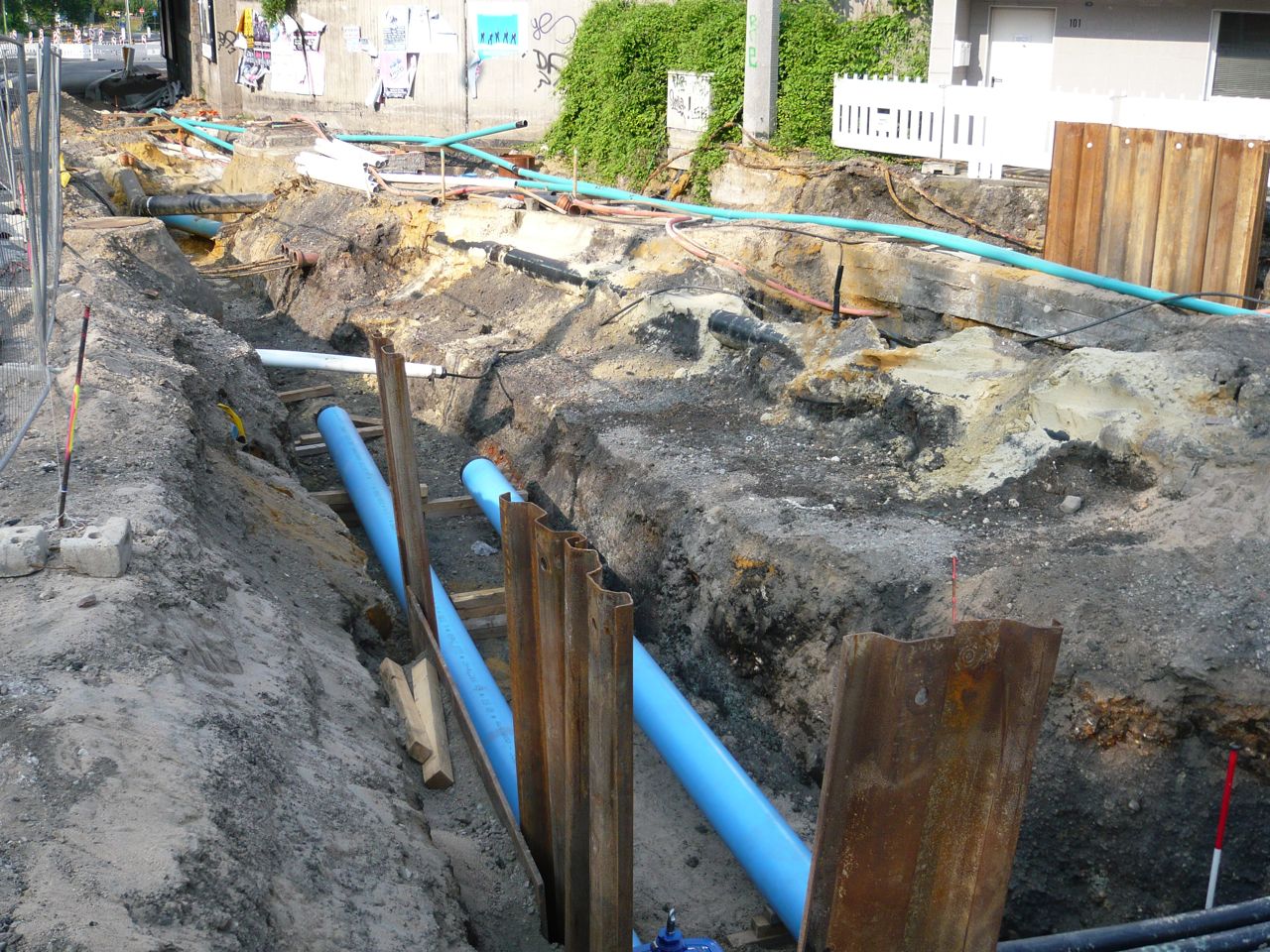 bigmama 11 Geschrieben 29. Juli 2014 Autor Geschrieben 29. Juli 2014 Der Schichtaufbau im Bereich der Gleise aus der Nähe (links wurde bereits die Gussasphaltdecke aufgebracht) Ich suchte Hänschen vergeblich, fand aber neue Wasserleitungen. Von oben (in´s Bild) entlang der Schederhofstrasse kommend, gibt es mit verkleinertem Querschnitt einen Abzweig mit Schieber nach rechts (zur Frohnhauser Strasse in Richtung Alfred-Krupp-Gymnasium) und etwas weiter zwei weitere nach links. Warum die Leitungen hier separat geführt werden, ist mir nicht bekannt. Vermutlich werden sie jedoch an den im Bildhintergrund zu erkennenden Bestand anschließen. ... Zitieren