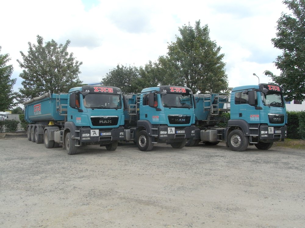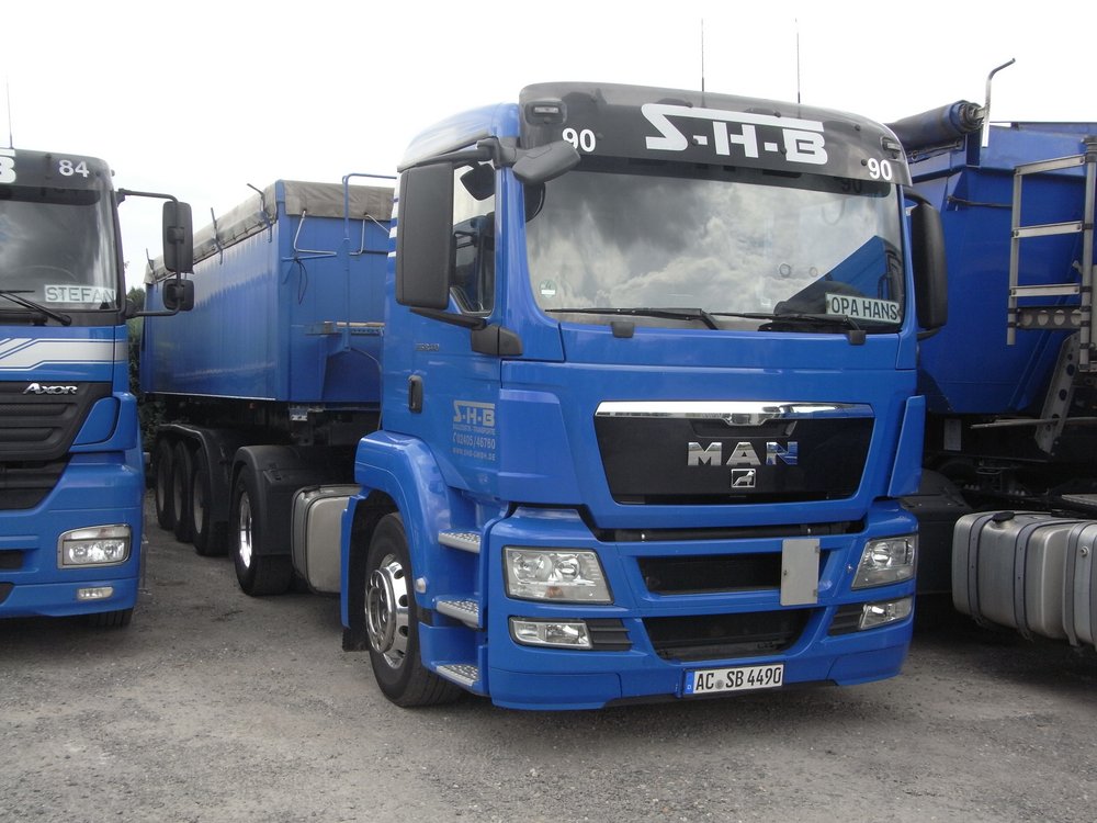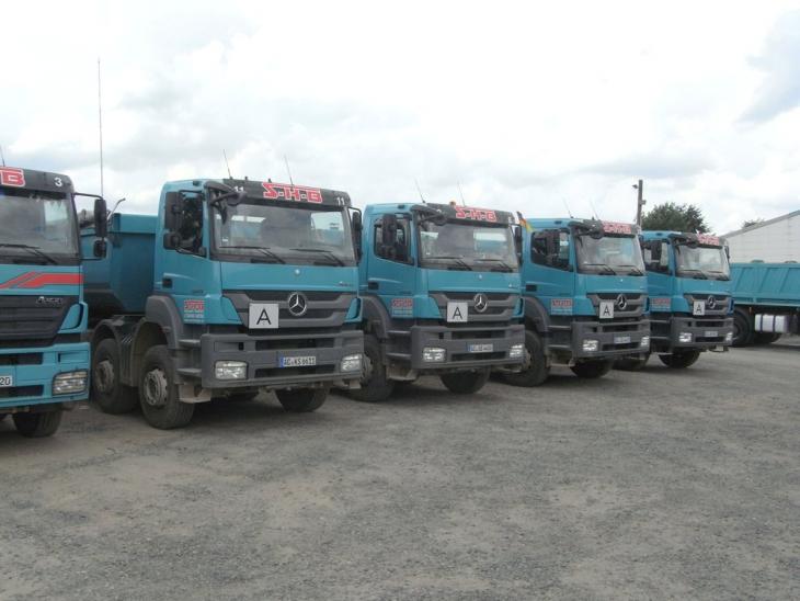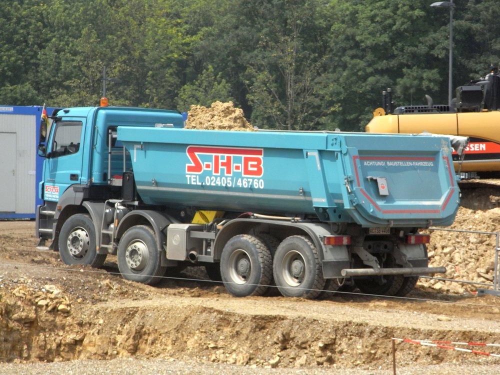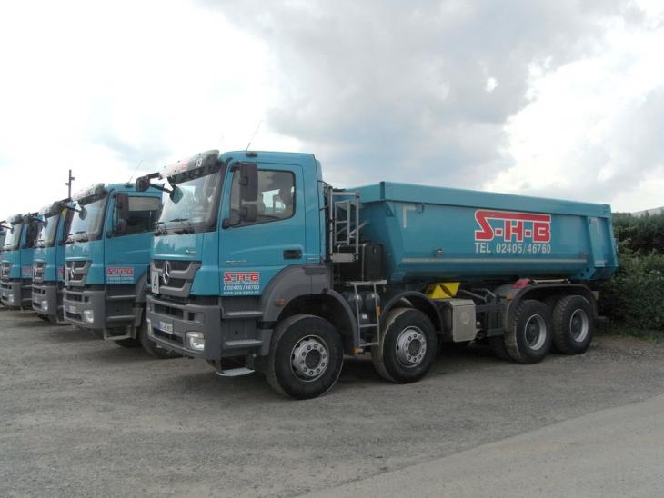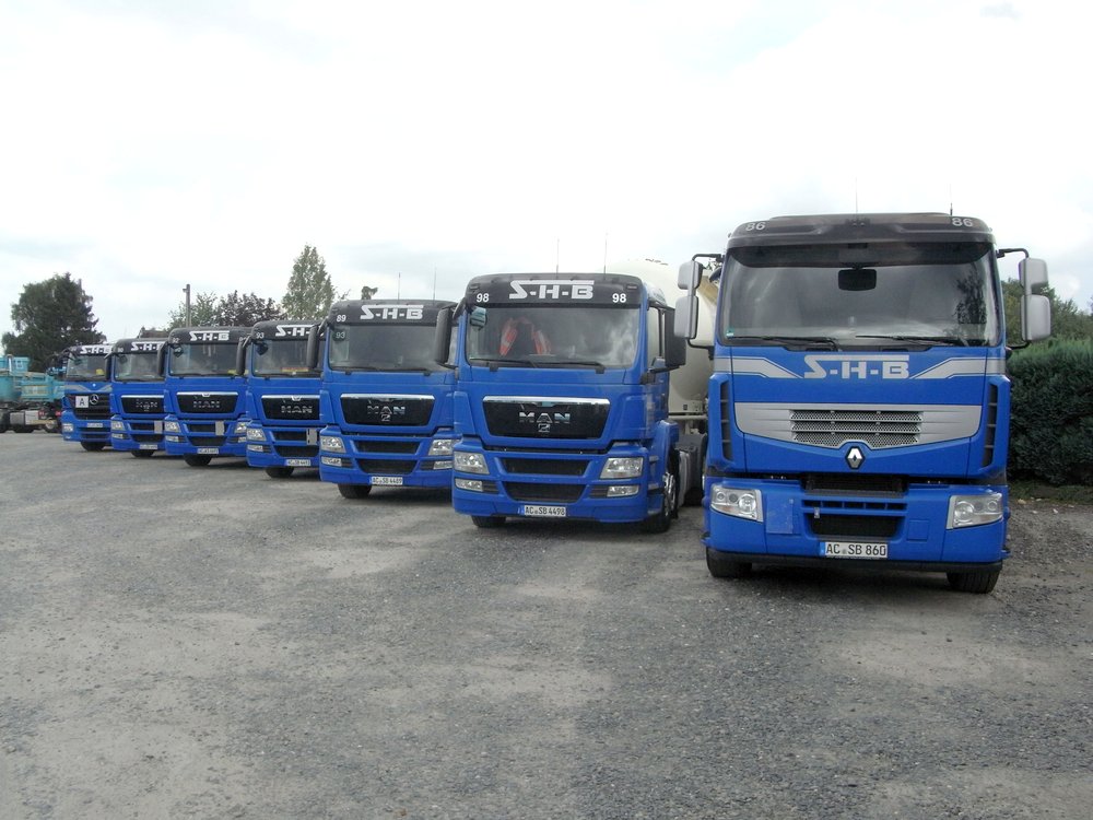 tomac 11.720 Geschrieben 2. August 2014 Geschrieben 2. August 2014 Die SHB Baulogistik und Transporte GmbH aus Würselen ist der größte Baulogistiker im Aachener Raum und ist der Spezialist für Entsorgung, Transporte und Baustoffhandel in der Euregio Maas-Rhein.Das Unternehmen ist 1993 aus den renommierten Unternehmen Kaspar Staerck GmbH Baustellen-Funk-Service und der Firma Habra GmbH Transporte und Baustoffhandel hervorgegangen. 75 Mitarbeiter disponieren und bewegen täglich über 50 Kipper und Silofahrzeuge für anspruchsvolle Aufträge zahlreicher Kunden aus dem Baugewerbe und der Industrie. Der sehr gepflegte Fuhrpark wird stets auf dem neusten Stand gehalten. War man bislang treuer Mercedes Kunde, so wurden in letzter Zeit einige MAN TGS Euro 5 Sattelzugmaschinen mit kurzer und langer Kabine und teilweise mit Hydrodrive beschafft. Weiterhin sind einige Mercedes Axor Euro 5 Vierachster der aktuellen Baureihe mit Rundmulden dazu gekommen. Exote im Fuhrpark ist ein Renault Premium. Weitere Einzelstücke sind ein Axor Zweiachser mit Kran und ein Axor Vierachser mit Hakengerät.Der Fuhrpark ist farblich zweigeteilt. Die blauen Fahrzeuge fahren hauptsächlich für die Glasindustrie. Hier finden sich die Silozüge und die Seitenkippzüge. Die türkisblauen Fahrzeuge laufen auf Baustellen und für sonstige Transporte.Nachdem die SHB Fahrzeuge immer wieder auf den diversen Baustellen im Aachener Raum auftauchen, wird es jetzt endlich Zeit, einen eigenen Thread für diese Firma zu eröffnen.An dieser Stelle noch einmal vielen Dank für's Bilder machen lassen auf dem Firmenhof. Da wurde heute wie jeden Samstag fleißig Fuhrparkpflege betrieben.Wir fangen aber an mit ein paar Bildern von den Baustellen. Zitieren