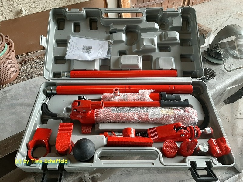 Timo 327 Geschrieben 11. September 2019 Autor Geschrieben 11. September 2019 Nabend zusammen, wie schon erwähnt, pünktlich zum Urlaubsende waren die Teile, u.a. der Hauptarm vom Sandstrahler zurück. Neues Werkzeug gab es dann auch noch, und zwar eine Karosseriepresse/Ausbeulsatz mit 10 Tonnen Presse und allerhand Zubehör. Hätte ich mir auch schon viel früher kaufen sollen, das hätte so manche Umformung von verbogenem Material erleichtert, und das war auch schon direkt der erste Einsatz 1 Zitieren