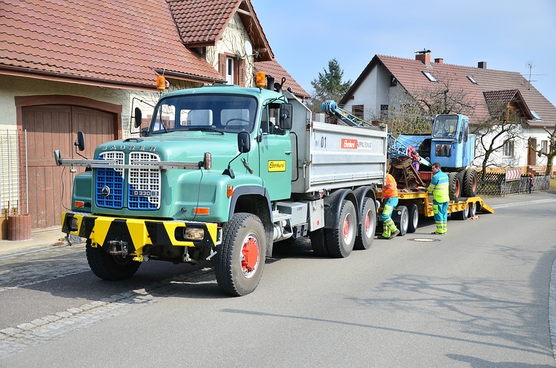Timo 327 Geschrieben 23. März 2015 Autor Geschrieben 23. März 2015 Weiter geht's mit Bildern von Transport:Ca. halb 11 sind wir dann am Grenzübergang Thayngen/ Bietingen angekommen.Danke der netten und sehr hilfsbereiten Zöllnerin lief auch alles glatt, lediglich eine dreiviertel Stunde hat es uns Aufenthalt am Zoll gekostet, aber für das, dass alles geklappt hat, haben wir das gerne in Kauf genommen Nun waren es noch wenige Kilometer bis ans Ziel bzw. an den neuen Heimatort des Fuchs-Baggers am Bodensee.Bei uns Daheim angekommen gab es ein kleines Empfangskomitee, einige Kollegen und Nachbarn warteten bereits auf den ankommenden Transport, andere hat es vom Sound des Saurer´s angezogen Gespann geparkt, Bagger los machen und laufen lassen, dann runter vom Tieflader. Gar nicht so einfach links den Fahrhebel zu bedienen und gegen zu steuern, rechts die Handbremse zum bremsen und gleichzeitig noch lenken Zitieren