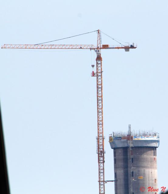 MAN Fan 6 Geschrieben 13. Juli 2015 Autor Geschrieben 13. Juli 2015 Die letzten sieben Kranstücke wurden am Sonntag in den Kran eingesetzt. Damit kommt er auf eine Hakenhöhe von ca. 263 Meter. Danach folgt ihm der Turm nach. Der nächste Stopp steht dann planmäßig erst wieder in 232 Metern auf Aussichtsplattform-Höhe an. Die soll Ende des Monats erreicht sein, wie der Projektkoordinator von TKE bei einem Baustellenrundgang erklärte – denn für Mittwoch 29. Juli sind rund 200 Gäste zum Richtfest geladen. Gut vier Meter wächst der Turm derzeit pro Tag. Der Rekord liegt bislang bei 4,65 Meter, wie der Oberpolier von Züblin, weiß.Für die letzte Etappe bis auf 244,1 Meter mit dem Aufbau für Treppen- und Maschinenhaus sowie Transportschacht werden nochmals die Gleitschalungselemente umgebaut. Seine Maximalhöhe von 246 Metern erreicht der Turm erst durch die Spitze der Außenhülle.Alles überragen wird weiter der Kran. Der bekommt aber Gesellschaft. Denn um beim Einbauen der Decken und der Treppenelemente zügiger voranzukommen, wird ein zweiter Kran auf die Plattform gesetzt werden.Von oben nach unten bekommt der Turm seine spiralförmige Hülle aus Glasfasergewebe in vier abgestuften Ausführungen, denn es wird nach oben hin immer durchsichtiger, so dass sich bei der Fahrt mit dem Panoramaaufzug zur Aussichtsplattform der Blick immer mehr öffnet.Bereits ab September beginnt TKE mit dem Einbau des Feuerwehraufzugs, der während der weiteren Bauzeit auch zum Transport von Lasten genutzt wird. Zitieren