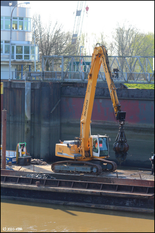 HBA 15.058 Geschrieben 12. September 2020 Autor Geschrieben 12. September 2020 Anfang April begannen endlich die eigentlichen Arbeiten am neuen Schleusentor. Im Vorhafen, unmittelbar vor dem Bestandsschleusentor, lagen der 23,40m lange und 8,31m breite Ponton "PII" (184t), eine Schute sowie der Schlepper "Kap Horn" der Tief- und Wasserbau Peter Janssen GmbH & Co. KG. Auf dem Ponton stand ein Longreachbagger Liebherr R934 Litronic mit Mehrschalengreifer der Firma G. Herfeld GmbH, baggerte die Sohle vor der Schleuse aus und verlud das Baggergut auf die Schute. 2 Zitieren