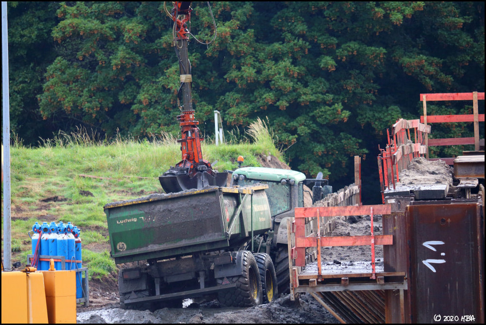 HBA 15.066 Geschrieben 14. August 2021 Autor Geschrieben 14. August 2021 Ende August 2020 kam ein Langarmbagger vom Typ Hitachi Zaxis 350LCN der Baggervermietung v. Barnekow GmbH mit Zweischalengreifer zum Einsatz, um einen durch Spundwandbohlen eingefassten Bereich, in welchem später die Toraufnahme entstehen wird, auszubaggern. Das Baggergut wird auf Traktorgespanne verladen, welche das Material dann abfahren. 5 Zitieren