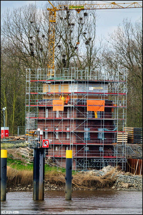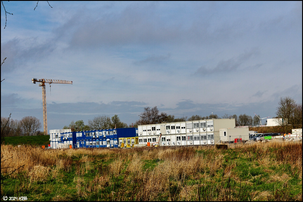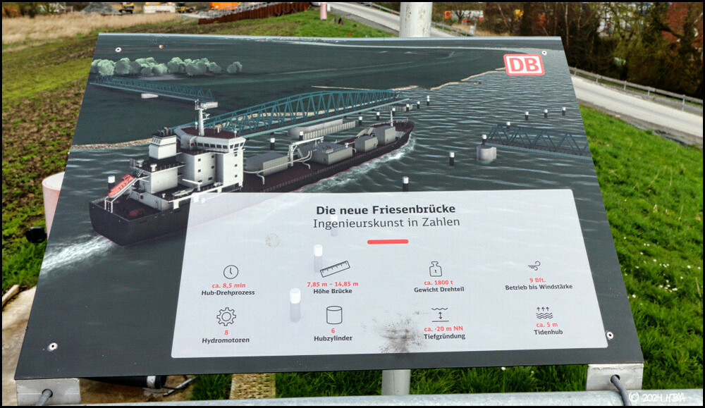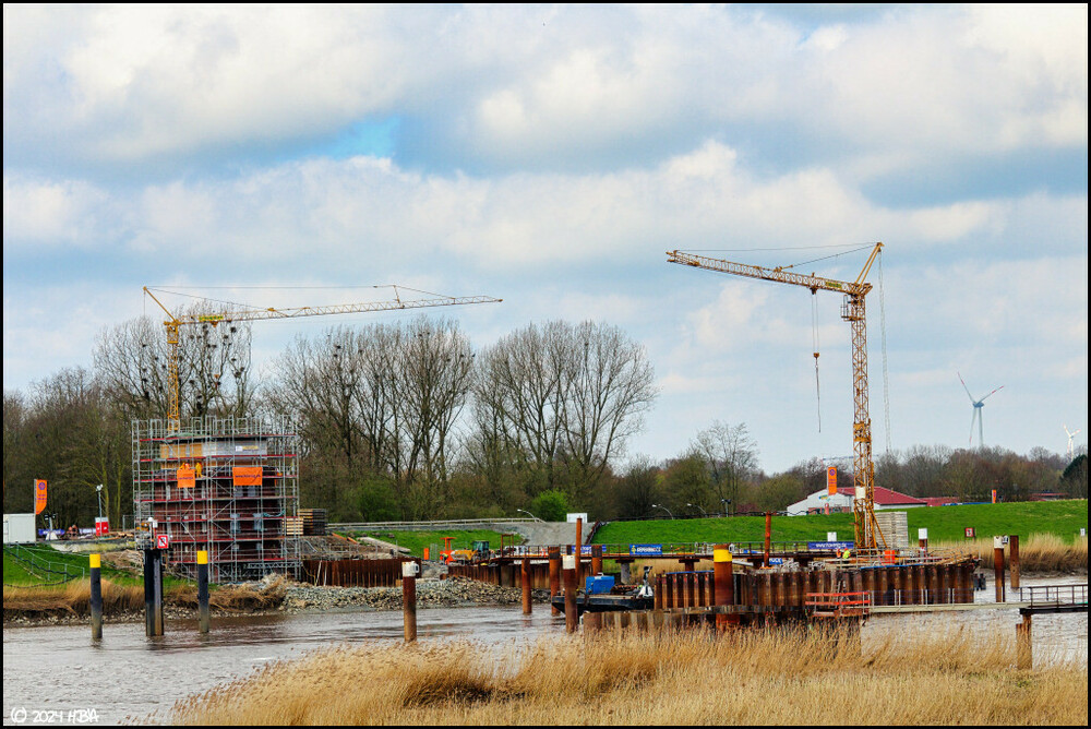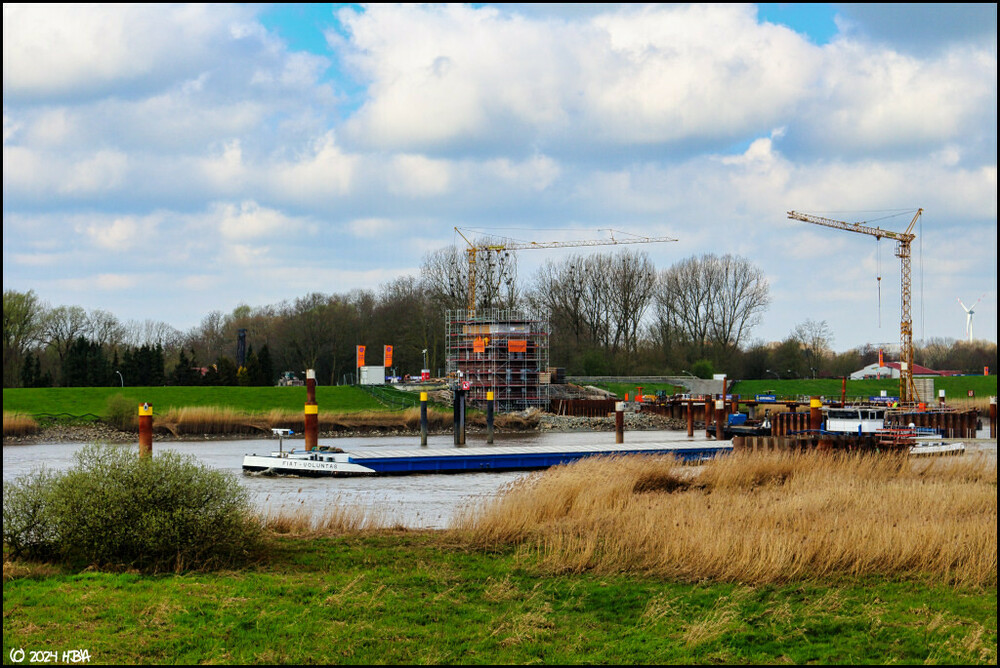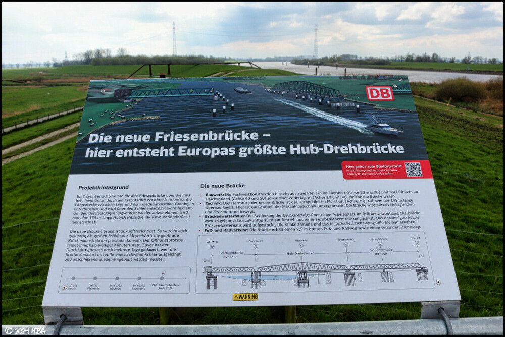HBA 14.955 Geschrieben 8. Juni 2024 Autor Geschrieben 8. Juni 2024 Ende März war ich noch einmal auf der Baustelle "Friesenbrücke", dieses Mal wieder auf der östlichen Flußseite bei Hilkenborg. Hier gibt es mittlerweile einen Aussichtspunkt auf dem Deich, welcher zwar sehr schön ausgebaut und mit Informationstafeln ausgestattet ist, allerdings auch nur sehr umständlich zu erreichen ist. Das letzte Foto in diesem Block zeigt den Blick zurück über die Ems flußaufwärts, die Halle neben dem Strommast gehört zur (Luftlinie 8km entfernten) Meyer Werft. 4 Zitieren
