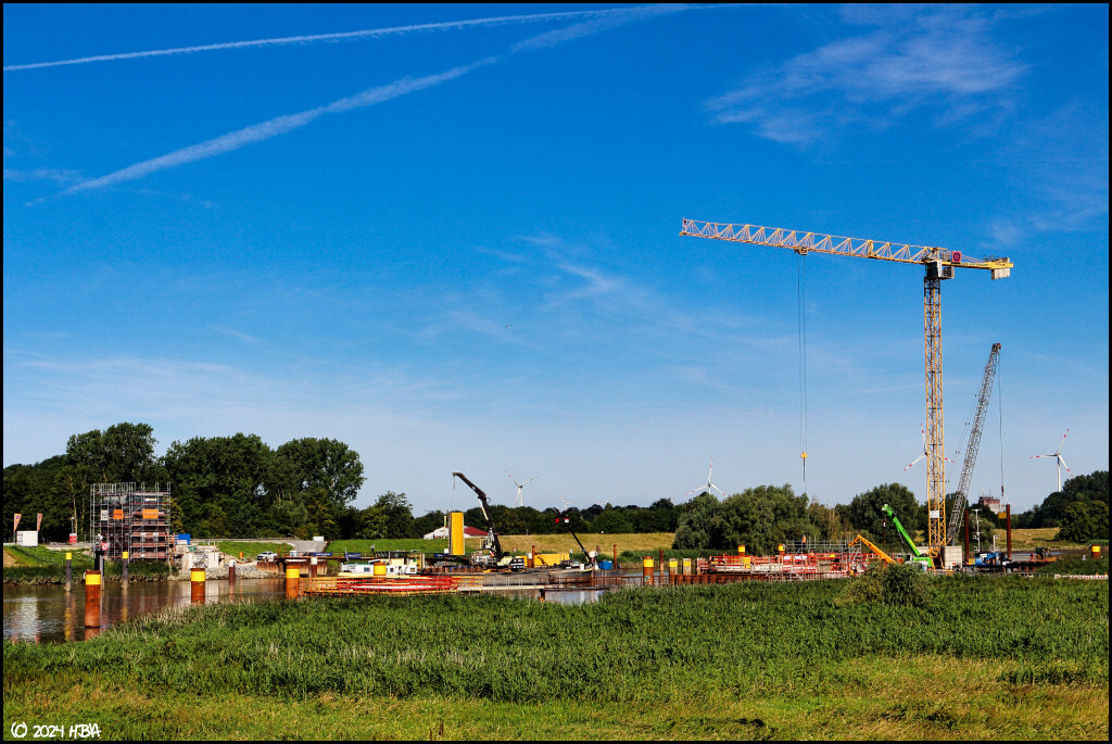 HBA 15.040 Geschrieben 6. November 2024 Autor Geschrieben 6. November 2024 Bilder vom Ersatzbau der Friesenbrücke bei Weener von Ende Juli. An besagtem Tage sollten auch erste fertig montierte Brückenteile per Schiff aus Papenburg nach Weener geliefert und eingehoben werden, allerdings war ich bereits am frühen Vormittag an der Baustelle, und die Lieferungen sollten nicht vor dem späten Nachmittag eintreffen... Für die sicherlich zahlreich eintreffenden Zuschauer hatte man am Aussichtspunkt sogar ordentlich geflaggt. Die Arbeiten für die Brücke über die Kreisstraße 22 auf der Landseite kam auch langsam voran, bei vermutlich drei Autos pro Stunde wirkt die Baustellenampel ein wenig oversized. Die Auffahrtrampe für die Bahnstrecke Richtung Leer war mittlerweile wohl komplett mit Spundwänden eingefasst. 4 Zitieren