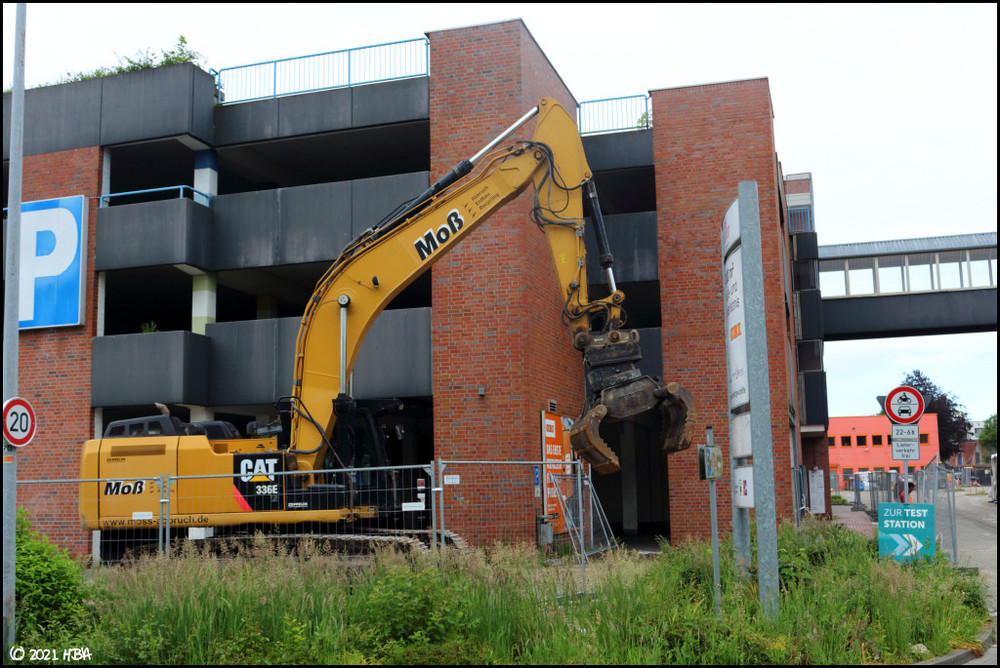 HBA 15.176 Geschrieben 18. Juni 2021 Autor Geschrieben 18. Juni 2021 Da der Rückbau des Ems-Centers mit seinem Parkhaus beginnt, wird der Liebherr 974 von der Rückseite des Hauptgebäudes auf den Parkplatz beim Parkhaus verlegt. Zusätzlich ist als weiterer Bagger jetzt ein Caterpillar 336E LN der Firma Moß vor Ort. Sowohl Hauptgebäude als auch Parkhaus sind mittlerweile komplett mit Bauzaun umstellt. Einzig der auf dem gleichen Areal befindliche Obi-Markt ist noch erreichbar. 6 Zitieren