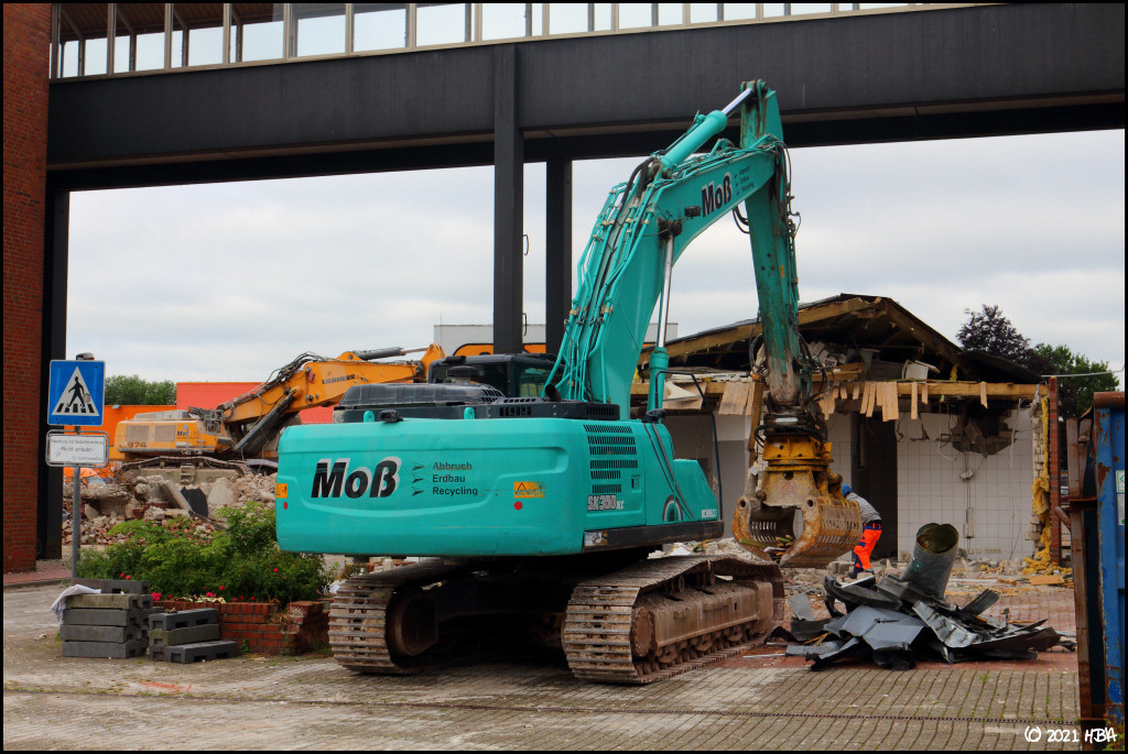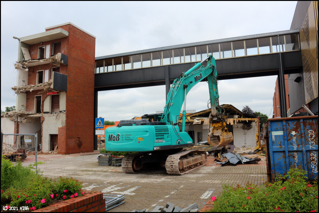 HBA 15.173 Geschrieben 11. September 2021 Autor Geschrieben 11. September 2021 Ems-Center-Abriß 24. Juni: Der Kobelco SK350 NLC ist damit beschäftigt, ein kleineres Nebengebäude abzureißen, in welchem früher unter anderem mal ein Fischladen und eine Pommesbude untergebracht waren. 5 Zitieren