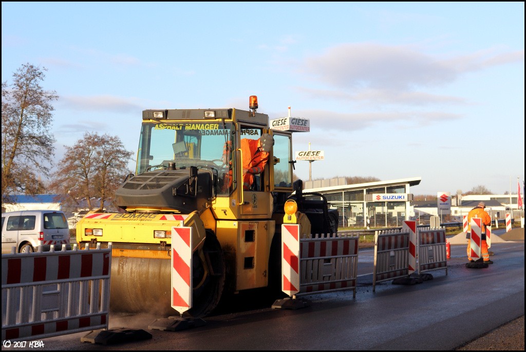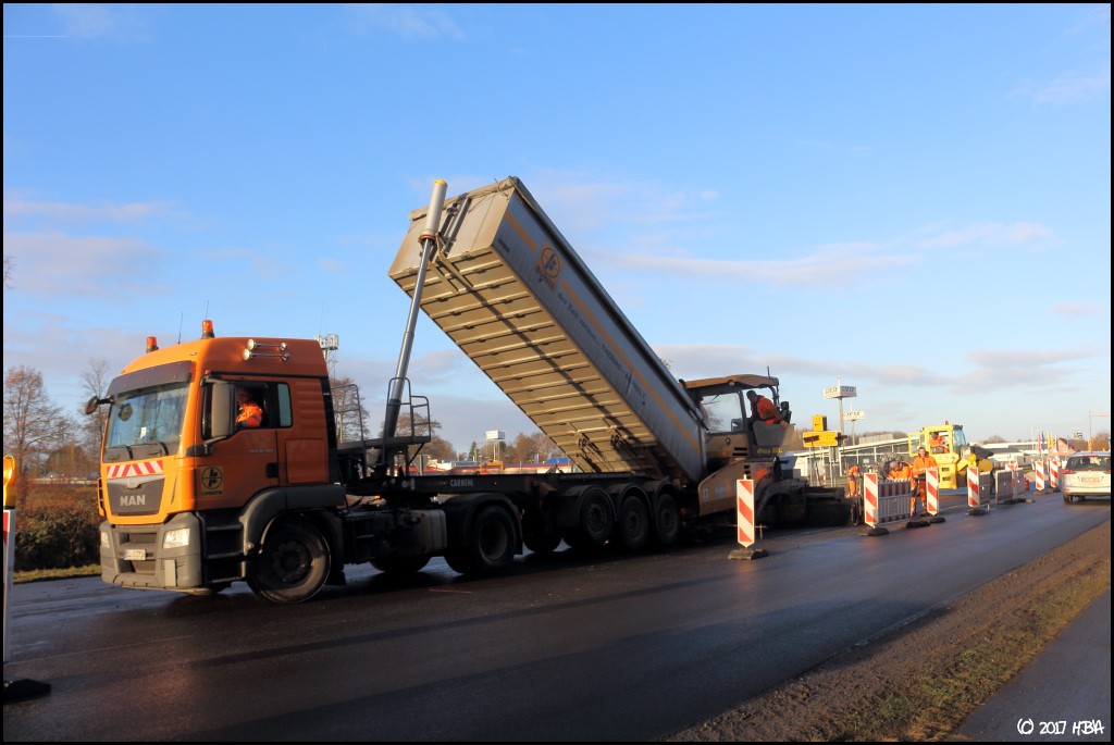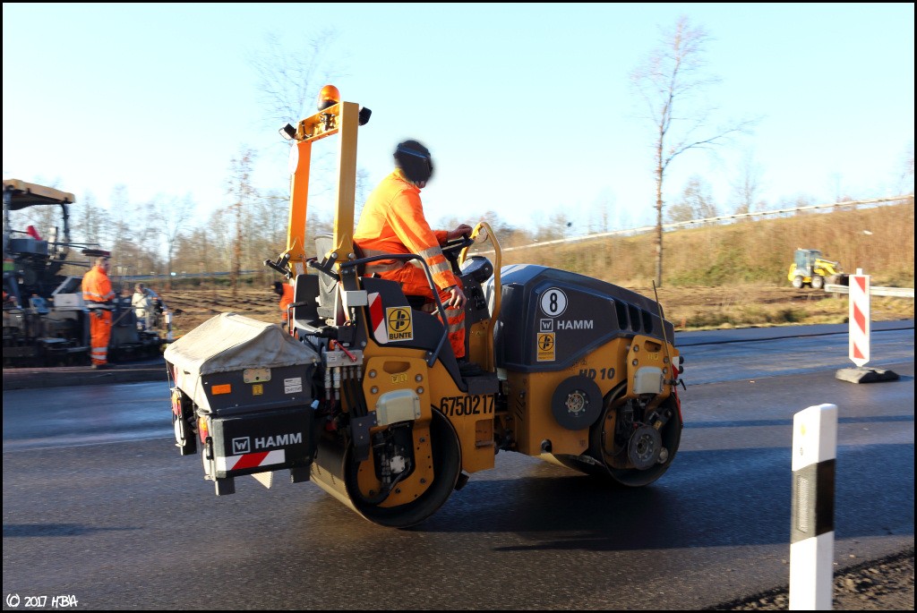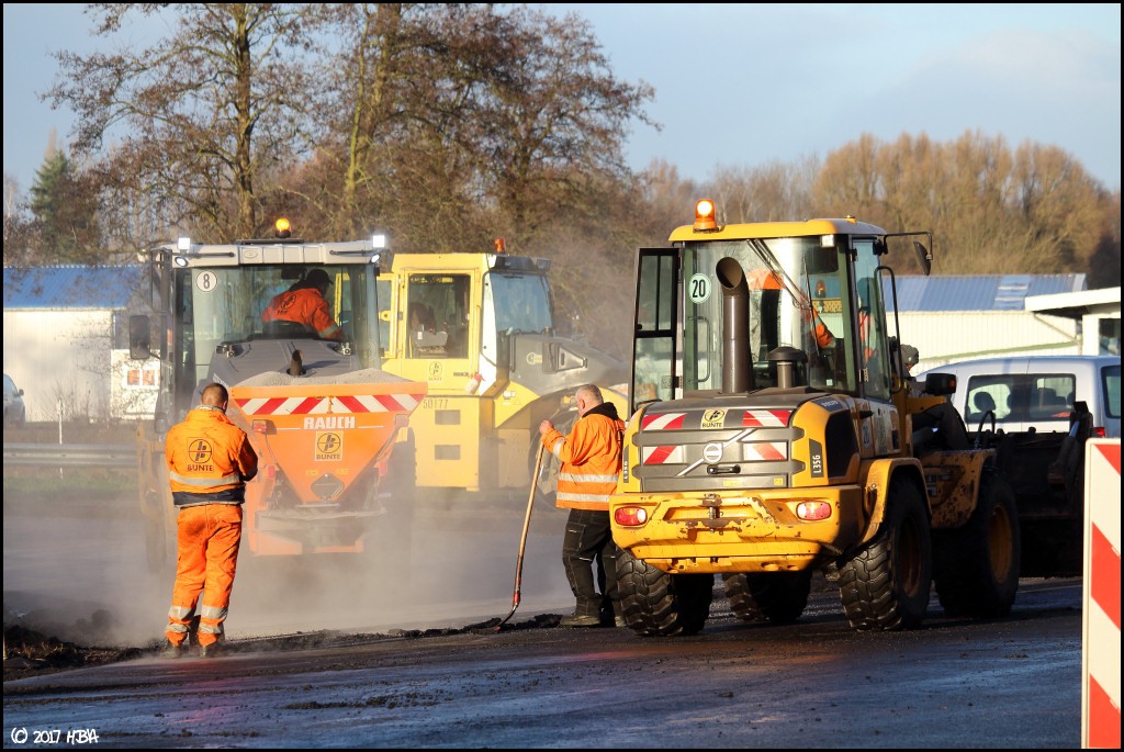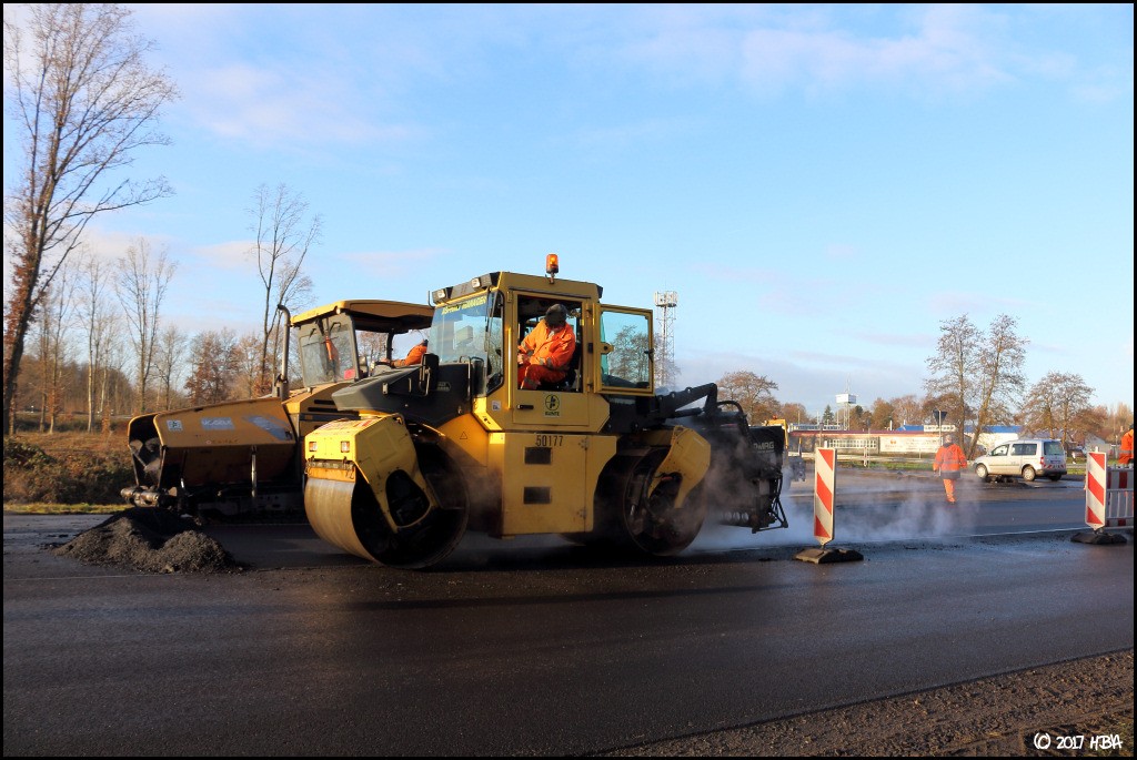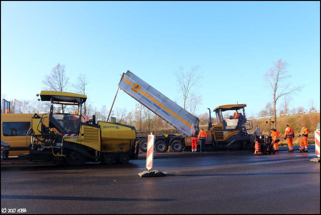 HBA 14.407 Geschrieben 10. Juni 2017 Autor Geschrieben 10. Juni 2017 Anfang Dezember begann man damit, einen Bauabschnitt am entgegen gesetzten Ende der Baustelle zu asphaltieren. In diesem Abschnitt liegen die Zu- und Abfahrten einer vielbefahrenen Bundesstrasse, die Arbeiten hier fanden nicht unter Vollsperrung statt. Vielmehr wurde der Verkehr von und zur Bundesstrasse unter Ampelregelung einspurig an der Baustelle vorbei geleitet. 1 Zitieren