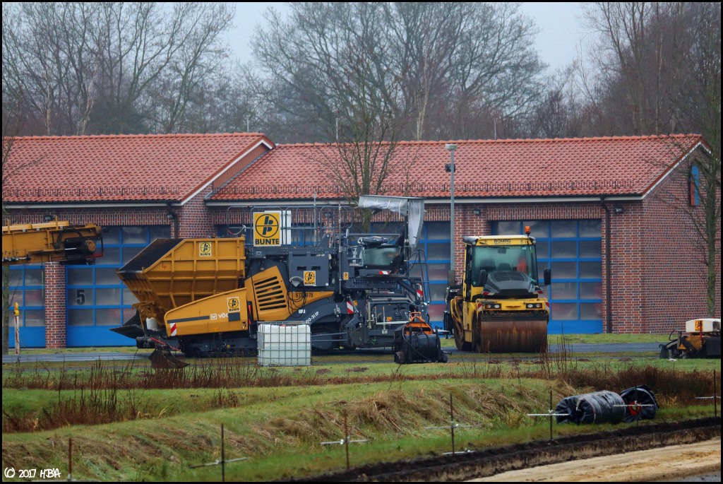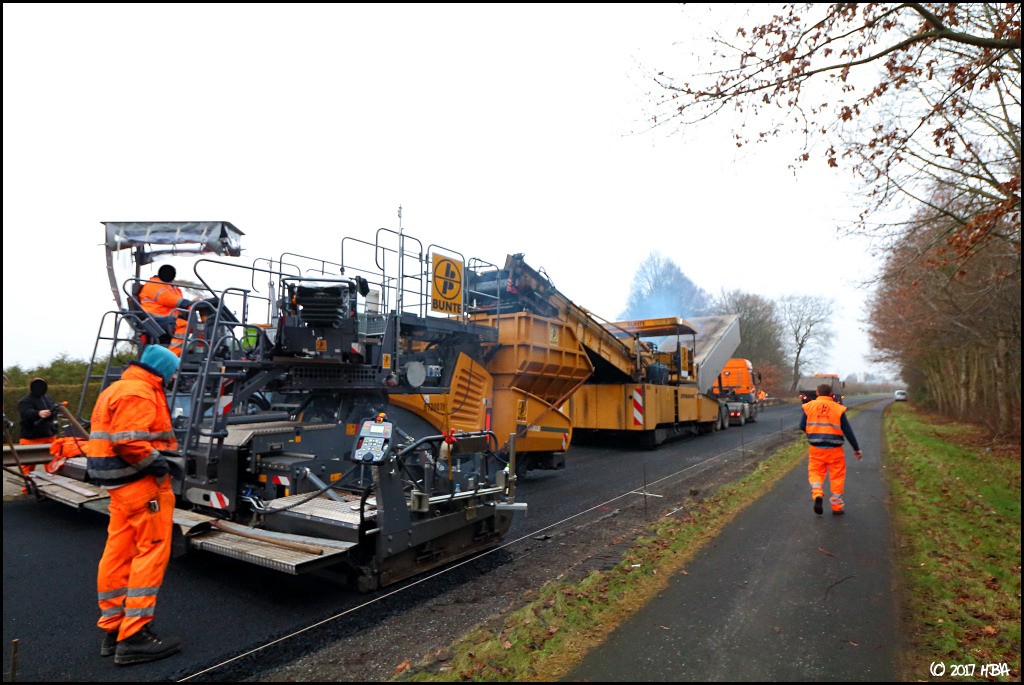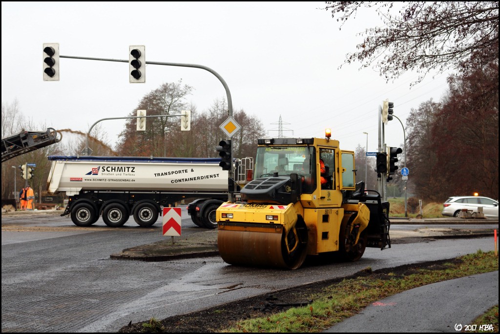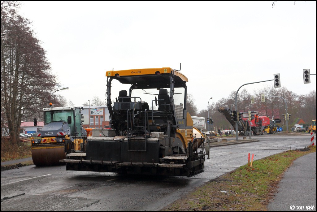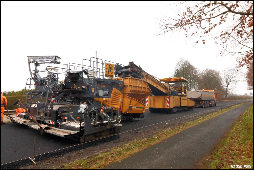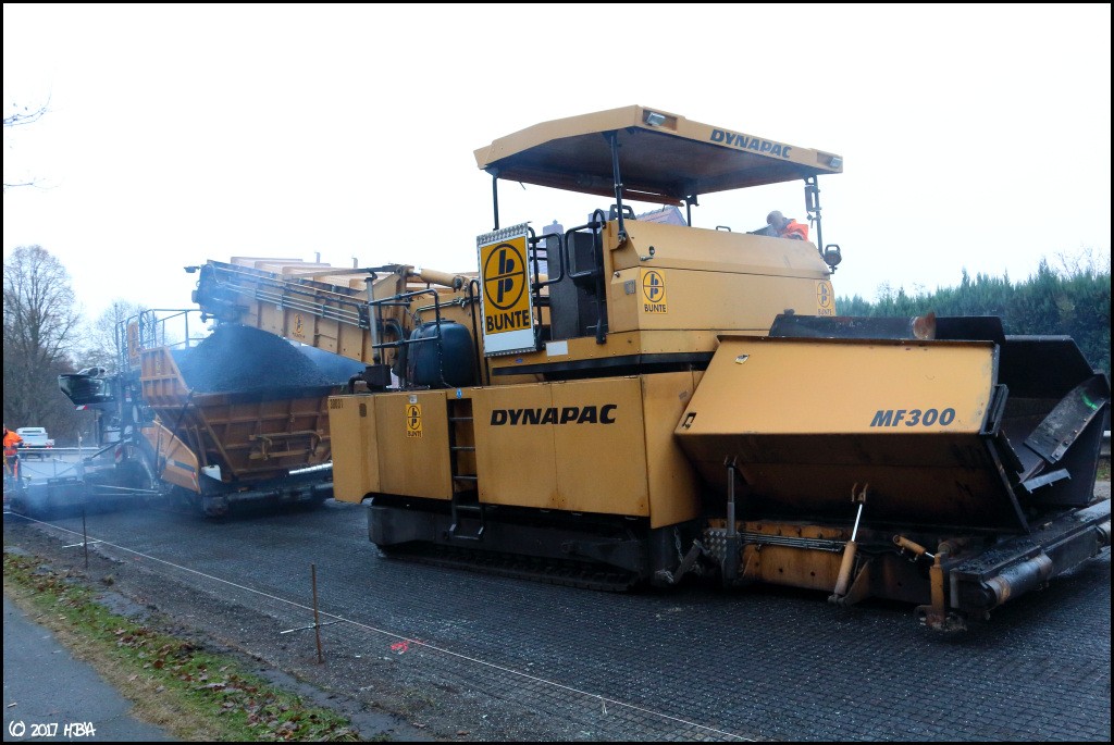 HBA 14.411 Geschrieben 22. Juli 2017 Autor Geschrieben 22. Juli 2017 Mitte Dezember 2016 standen wieder Asphaltierungsarbeiten an, diesmal auf dem mittleren Stück der Baustelle, welches zuletzt bearbeitet wurde. Zum Einsatz kam ein Vögele Super 2100-3i IP Fertiger, unterstützt von einem Dynapac MF300 Beschicker. Verdichtet wurde mit Hamm und Bomag-Walzen. 2 Zitieren