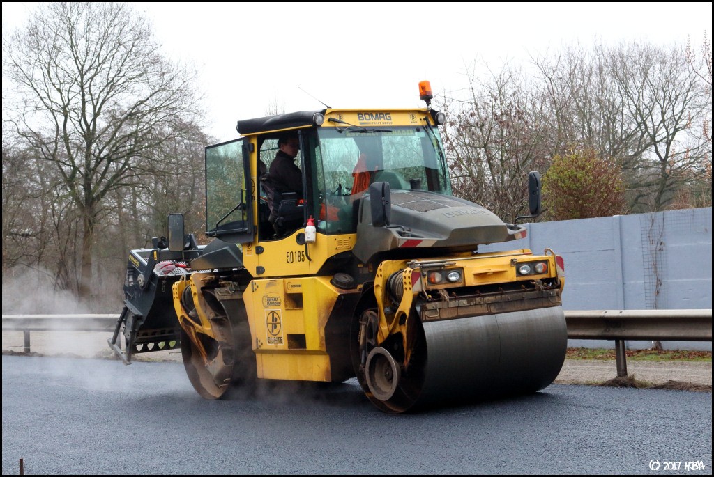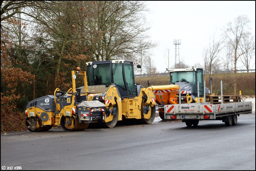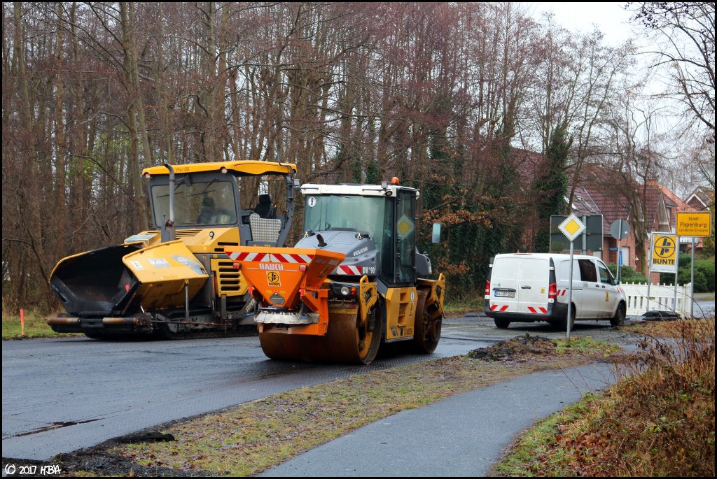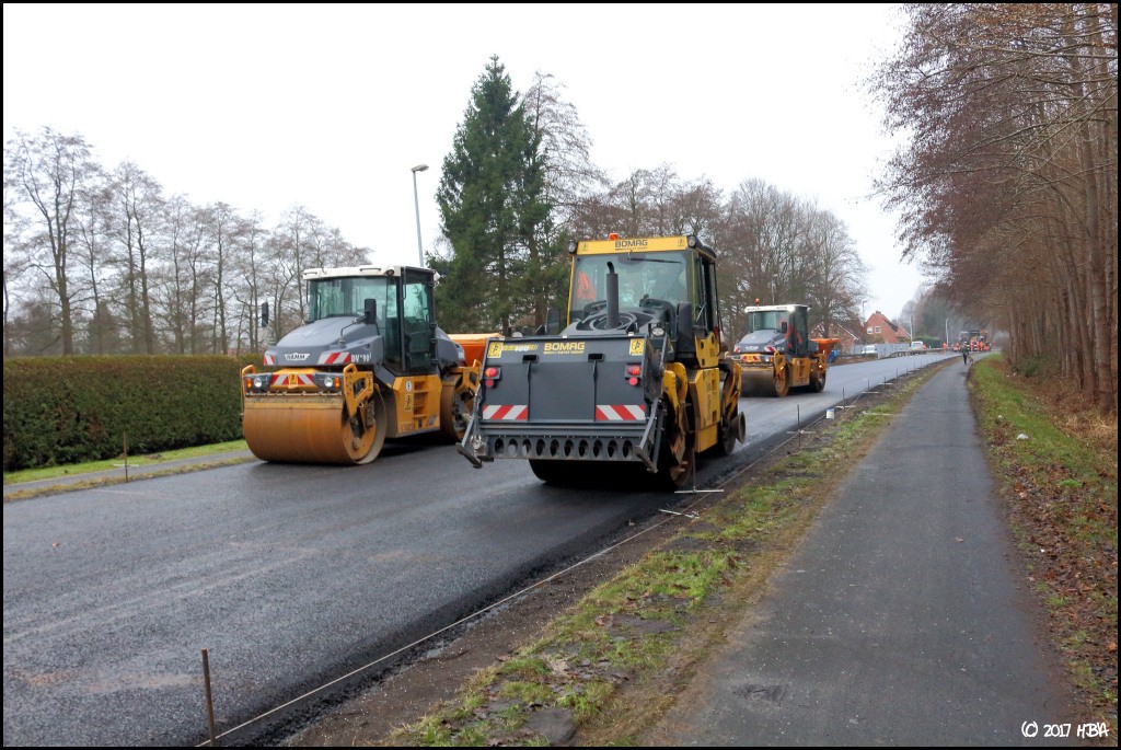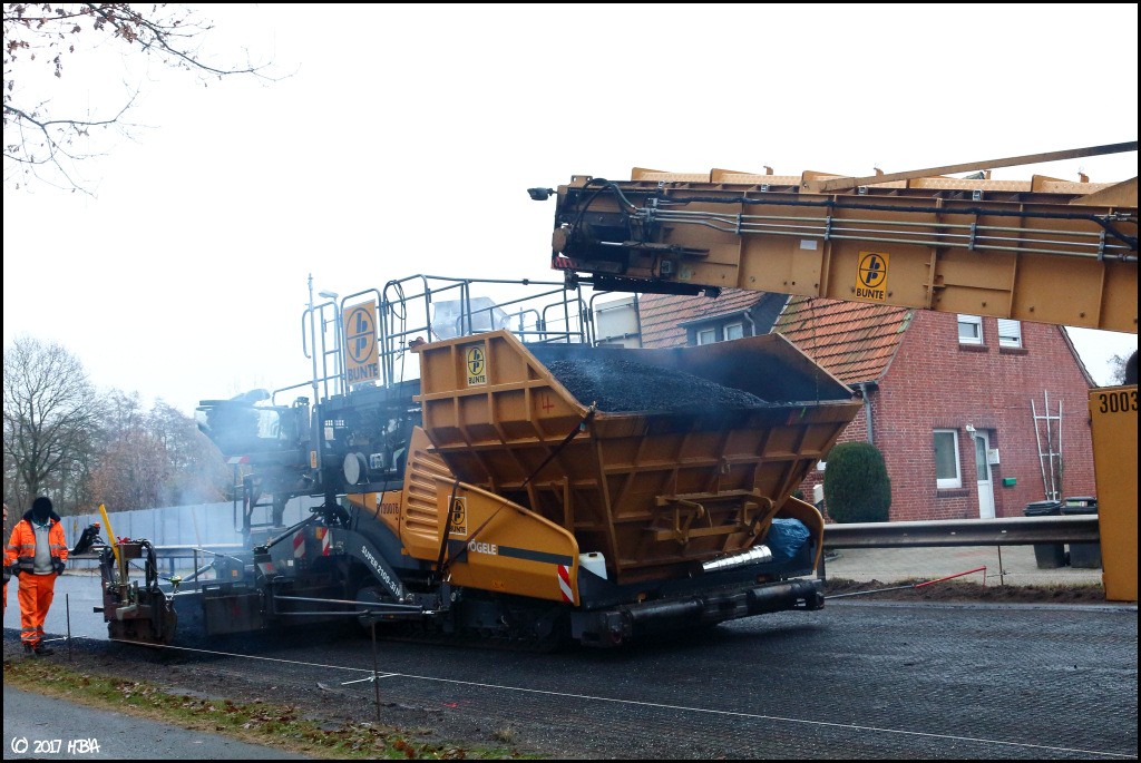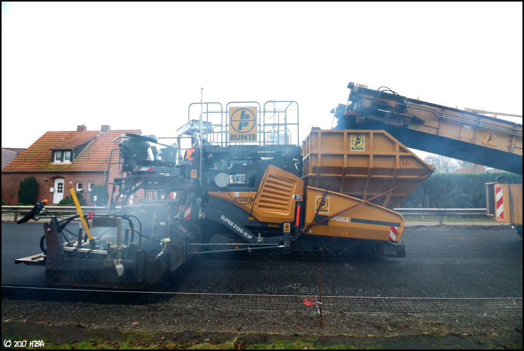 HBA 14.411 Geschrieben 22. Juli 2017 Autor Geschrieben 22. Juli 2017 Mitte Dezember 2016 standen wieder Asphaltierungsarbeiten an, diesmal auf dem mittleren Stück der Baustelle, welches zuletzt bearbeitet wurde. Zum Einsatz kam ein Vögele Super 2100-3i IP Fertiger, unterstützt von einem Dynapac MF300 Beschicker. Verdichtet wurde mit Hamm und Bomag-Walzen. 2 Zitieren