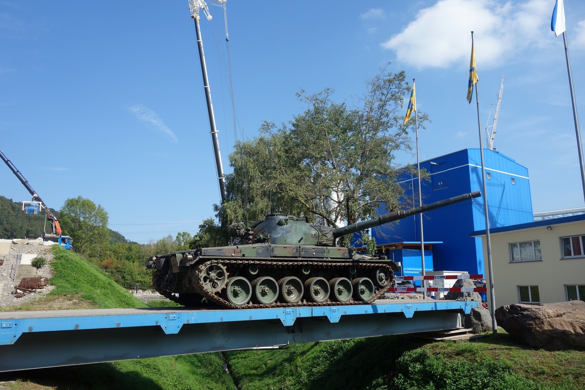 leon98 2.792 Geschrieben 15. September 2018 Autor Geschrieben 15. September 2018 Die Bauschuttaufbereitungsanlage war heute Nachmittag auch in Betrieb, allerdings nur zur Demonstration; Zur Beschickung wird hier ein Hyundai HX 330 eingesetzt. Das Biomassekraftwerk läuft 24h täglich, und hier wurde regulär gearbeitet. Ein fest montierter Sennebogen 830 ist hier für den Altholzumschlag zuständig. Eine weiterer Zweig der Firma Richi ist die Vermietung von Hilfs- bwz. Panzerbrücken. Hier eine solche mit einem Panzer 68 der Schweizer Armee: Die ausgestellten Krane standen leider etwas auf engem Raum, deshalb waren vernünftige Fotos nicht möglich. Den Liebherr 1130 konnten die Kinder bedienen: Zitieren
