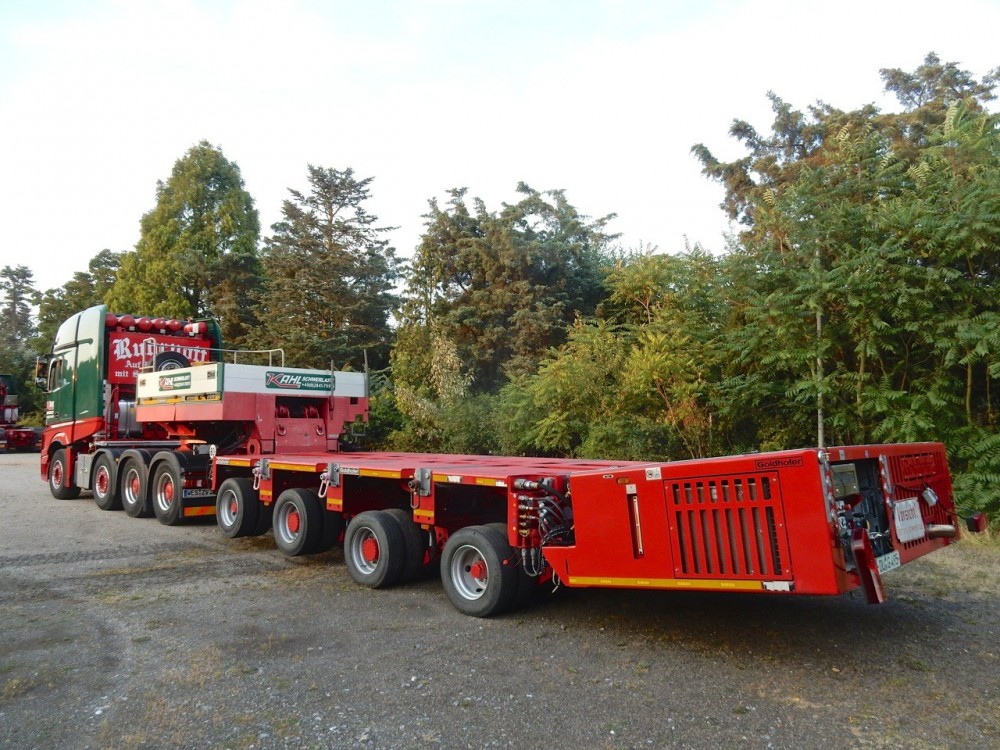 tomac 11.854 Geschrieben 8. Juli 2018 Geschrieben 8. Juli 2018 Und so sah der Transport dann nach dem Umbau in Schiefbahn aus. 2x26 Achslinien reduzieren die Achslast auf die erforderliche Höhe. Gezogen bzw. geschoben wird der Anhänger mit zwei Mercedes Actros / Titan 4165 Zugmaschinen. Diese beiden 8x6 Vierachser setzt Kahl immer für derartige Transporte ein. 2 Zitieren